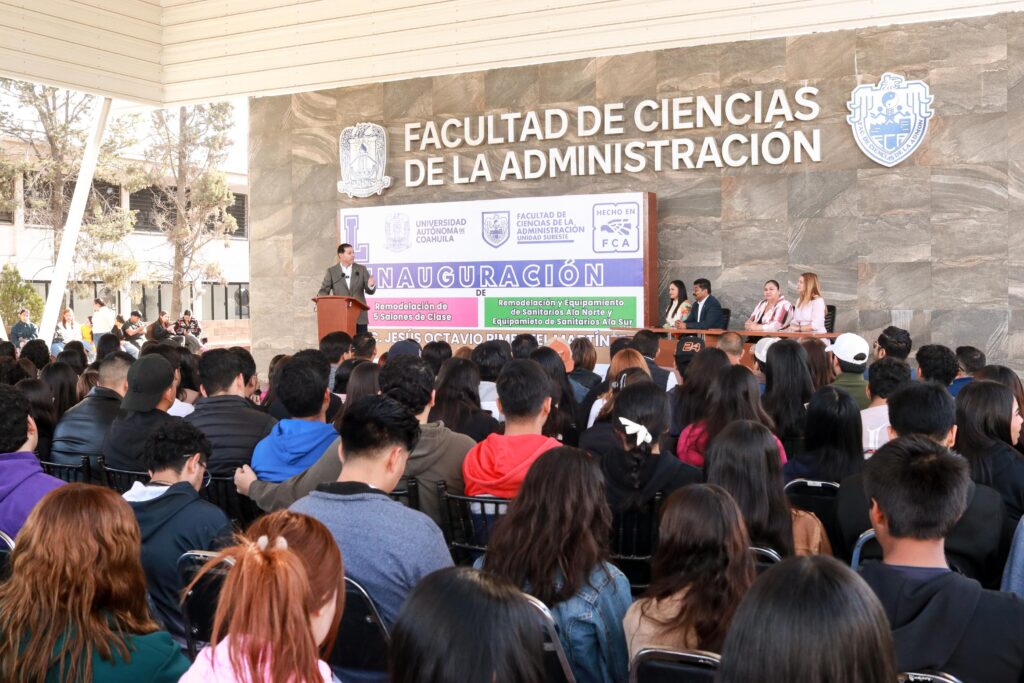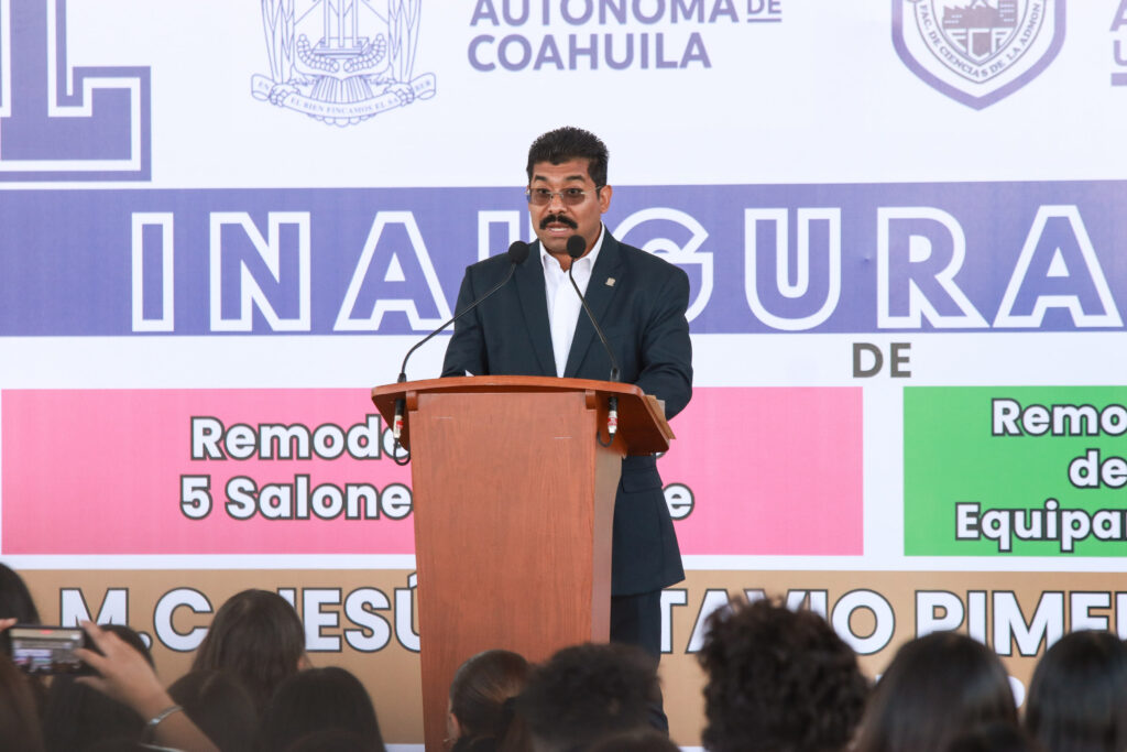 El rector de la Universidad Autónoma de Coahuila, Octavio Pimentel Martínez, inauguró la remodelación de cinco salones de clase y la rehabilitación y equipamiento de sanitarios norte y equipamiento de sanitarios sur de la Facultad de Ciencias de la Administración (FCA) Unidad Sureste.