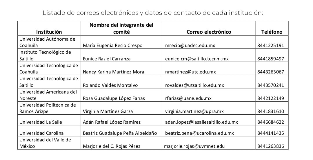 En esta edición participan instituciones como la Universidad Autónoma de Coahuila (UA de C), el Instituto Tecnológico de Saltillo (ITS), la Universidad La Salle Saltillo, la Universidad Tecnológica de Coahuila (UTC), la Universidad Tecnológica de Saltillo (UTS), la Universidad Americana del Noreste (UANE), la Universidad Politécnica de Ramos Arizpe (UPR), la Universidad Carolina y la Universidad del Valle de México (UVM).