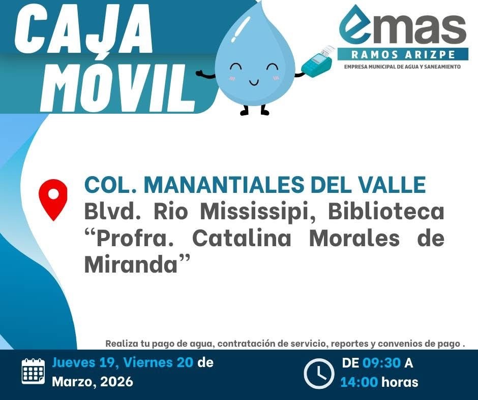 La Empresa Municipal de Aguas y Saneamiento (EMAS) en Ramos Arizpe puso en marcha la modalidad de una “Caja Móvil” en la colonia Manantiales del Valle, al oriente de la ciudad acercando atención directa a los usuarios sin necesidad de trasladarse a oficinas centrales, lo anterior con el fin de facilitar el acceso a trámites y servicios.