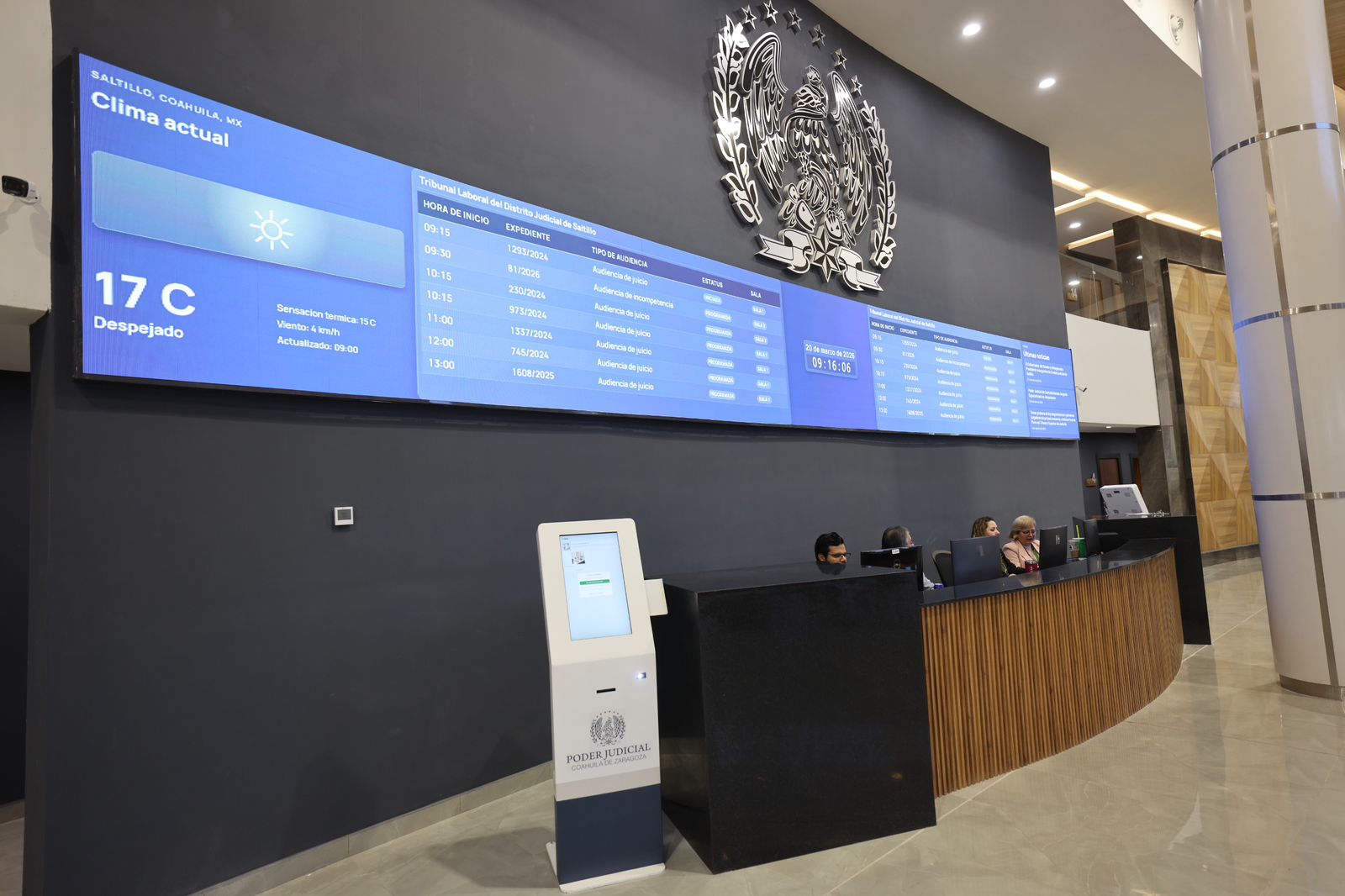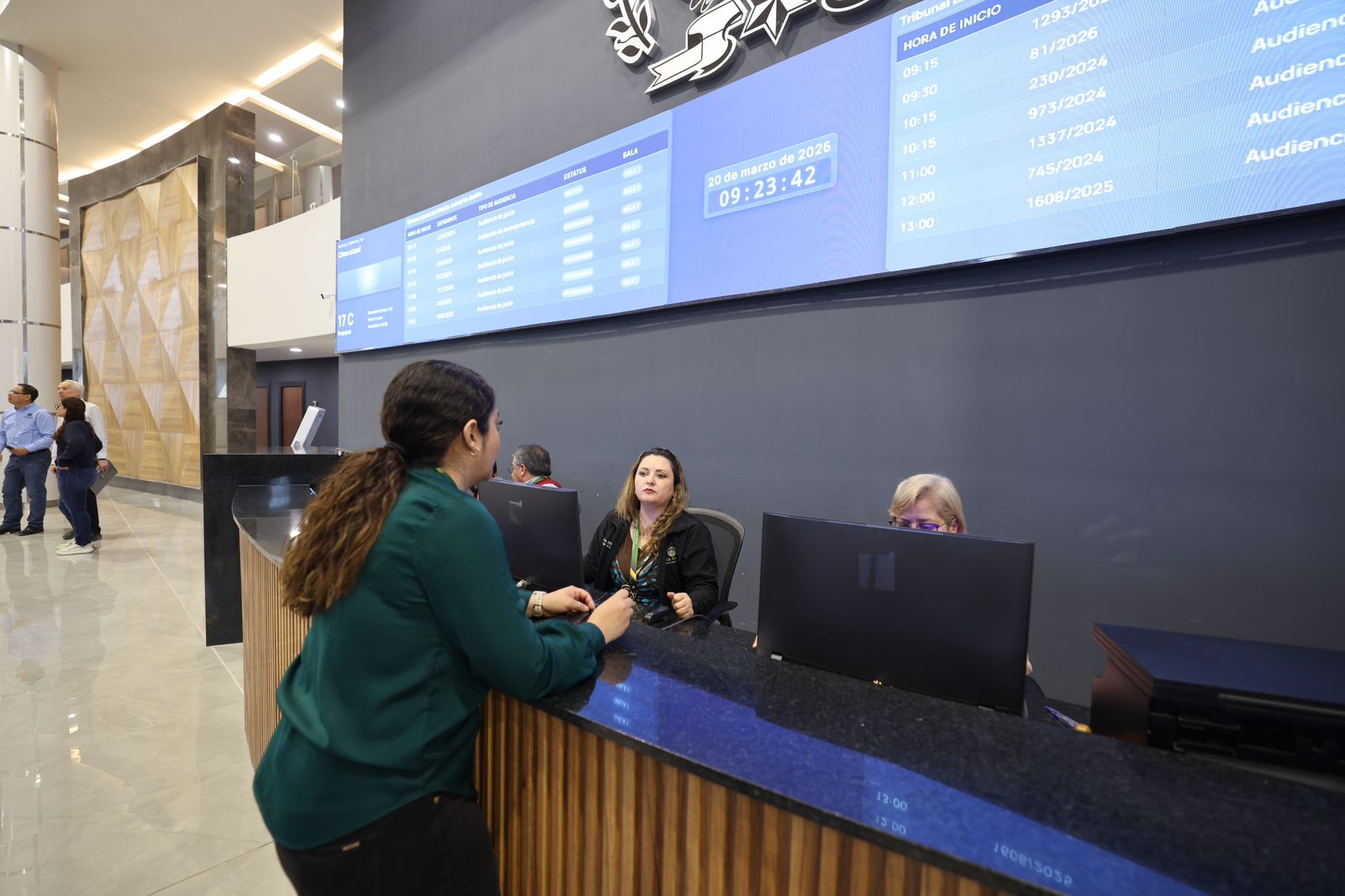 En el lobby principal, las y los usuarios podrán consultar los roles de audiencias en pantallas informativas donde se les indicará la sala correspondiente. Asimismo, la oficialía de partes contará con una pantalla que mostrará el turno y la ventanilla de atención asignada. Personal de apoyo estará disponible en todo momento para orientar a quienes acudan.