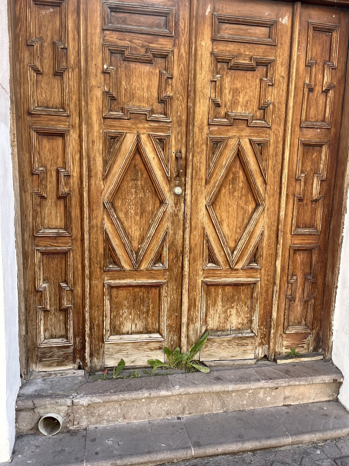 La puerta de madera ha perdido su protección y está expuesta a la humedad y los elementos, mientras que los cristales y sus vitrales de esta entrada están quebrados.