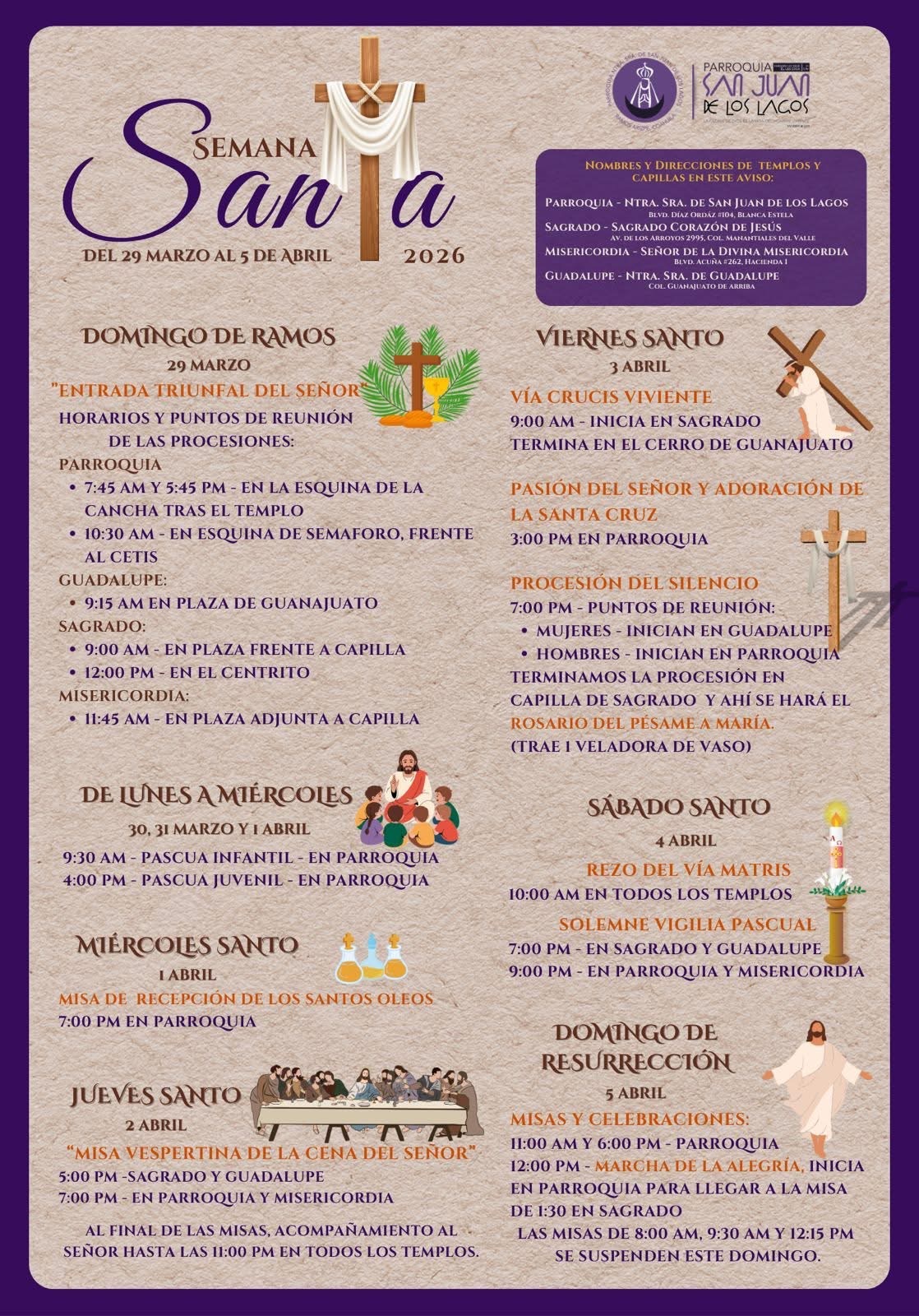 La parroquia de Nuestra Señora de San Juan de los Lagos en Ramos Arizpe, dio a conocer el programa de actividades con motivo de la Semana Santa 2026, que se llevará a cabo del 29 de marzo al 5 de abril, con celebraciones religiosas, procesiones y actos litúrgicos en distintos puntos del municipio.