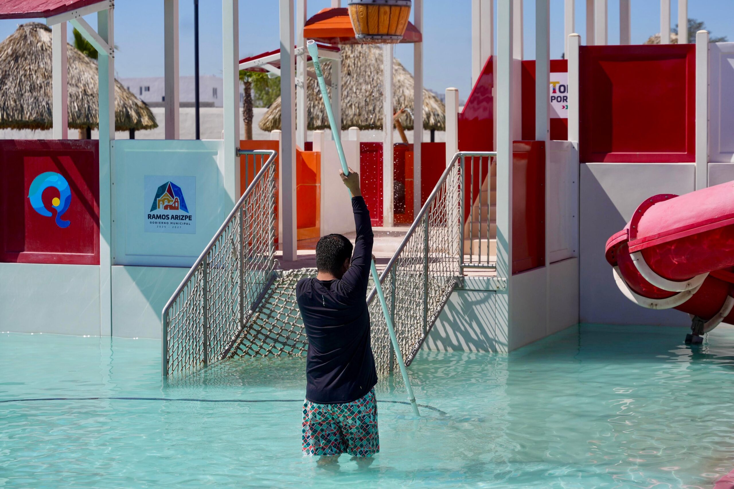Como parte de los preparativos, el alcalde Tomás Gutiérrez Merino, realizó un recorrido para verificar los trabajos de mantenimiento que se llevaron a cabo en distintas áreas de Aqua Ramos, como baños, toboganes, resbaladeros, palapas y cuartos de máquinas, con el objetivo de garantizar el óptimo funcionamiento de las instalaciones durante toda la temporada.