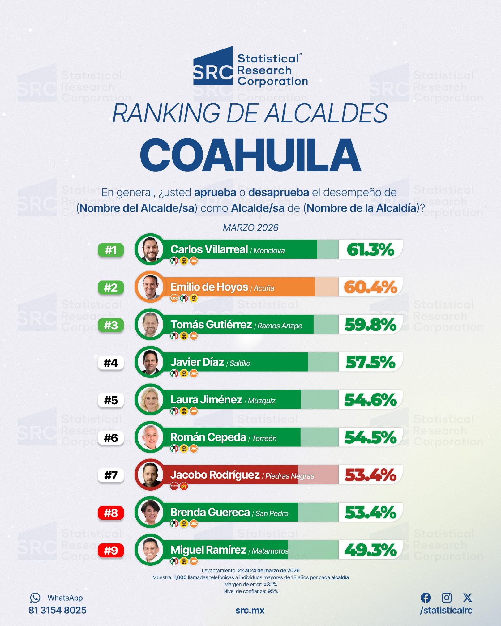 El alcalde de Ramos Arizpe, Tomás Gutiérrez Merino, se colocó en la tercera posición del ranking estatal de aprobación ciudadana, de acuerdo con el estudio correspondiente a marzo de 2026 realizado por la casa encuestadora Statistical Research Corporation (SRC), consolidándose como uno de los ediles mejor evaluados en Coahuila.