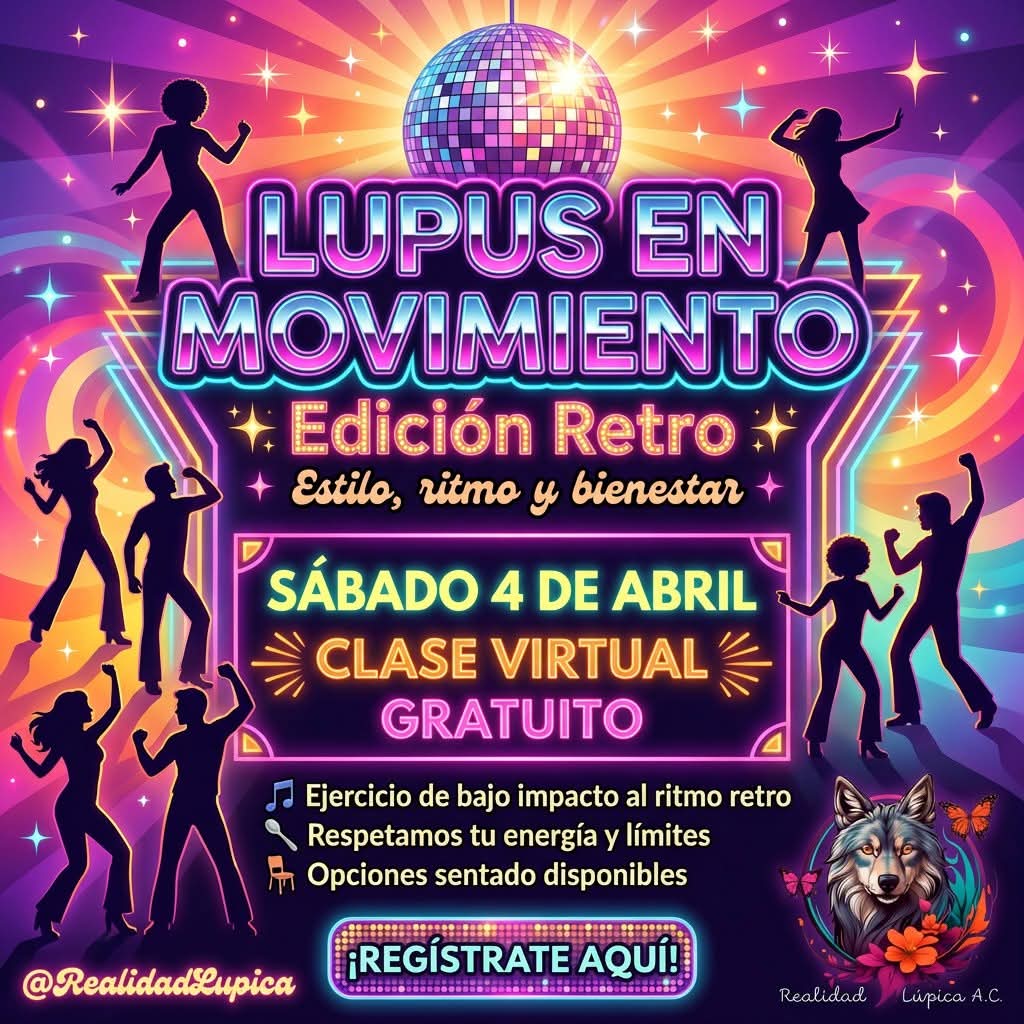 La asociación Abraza con Amor AC (AMMA) informó que este sábado 4 de abril tendrá lugar la clase virtual Lupus en Movimiento Edición Retro, que se impartirá a través de la plataforma Google Meet, y en la que las y los pacientes de esa enfermedad autoinmune podrán activarse y realizar al mismo sus mejores pasos al ritmo de la mejor música disco de antaño.