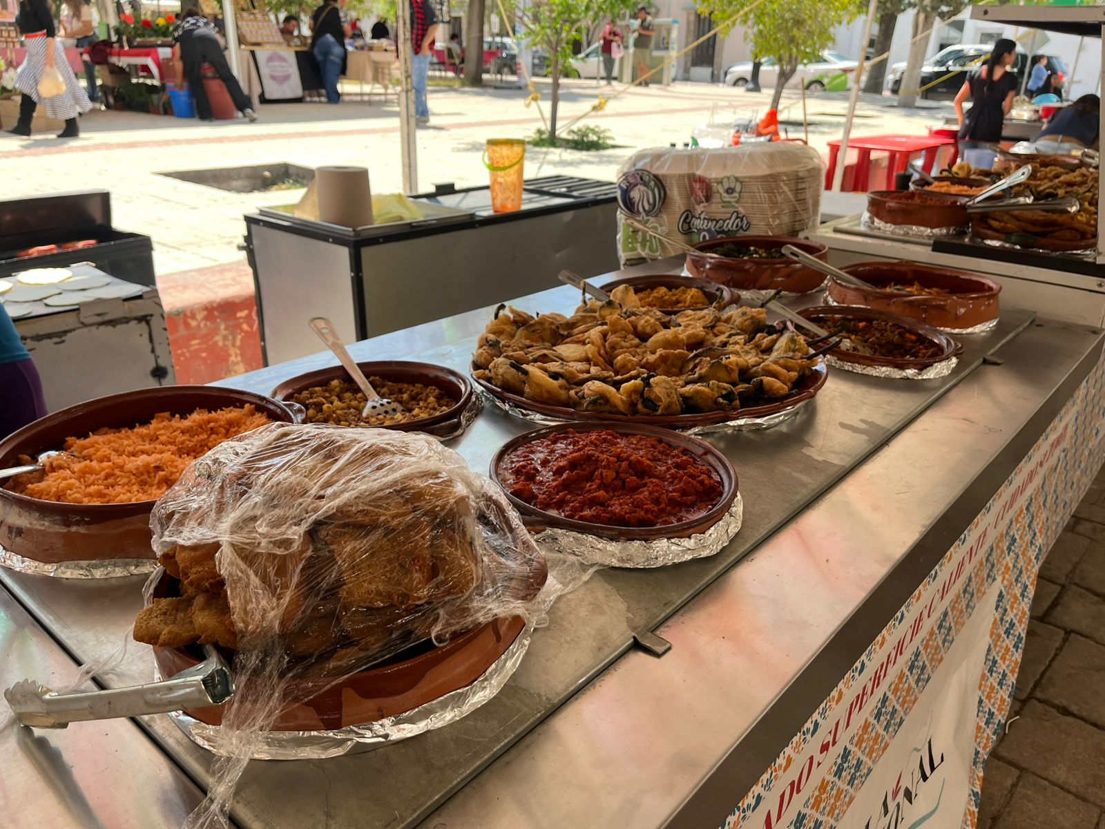 «Estamos bien preparadas para que todas se vayan con muy buen sabor de boca, ahorita tenemos flor de palma, acelgas, nopalitos, cabuches, asado tradicional, filete de pescado, papitas con picadillo, tortitas de papa y camarón», expresó Brenda Zitlalli Martínez Flores, una de las Cocineras Tradicionales anfitrionas.