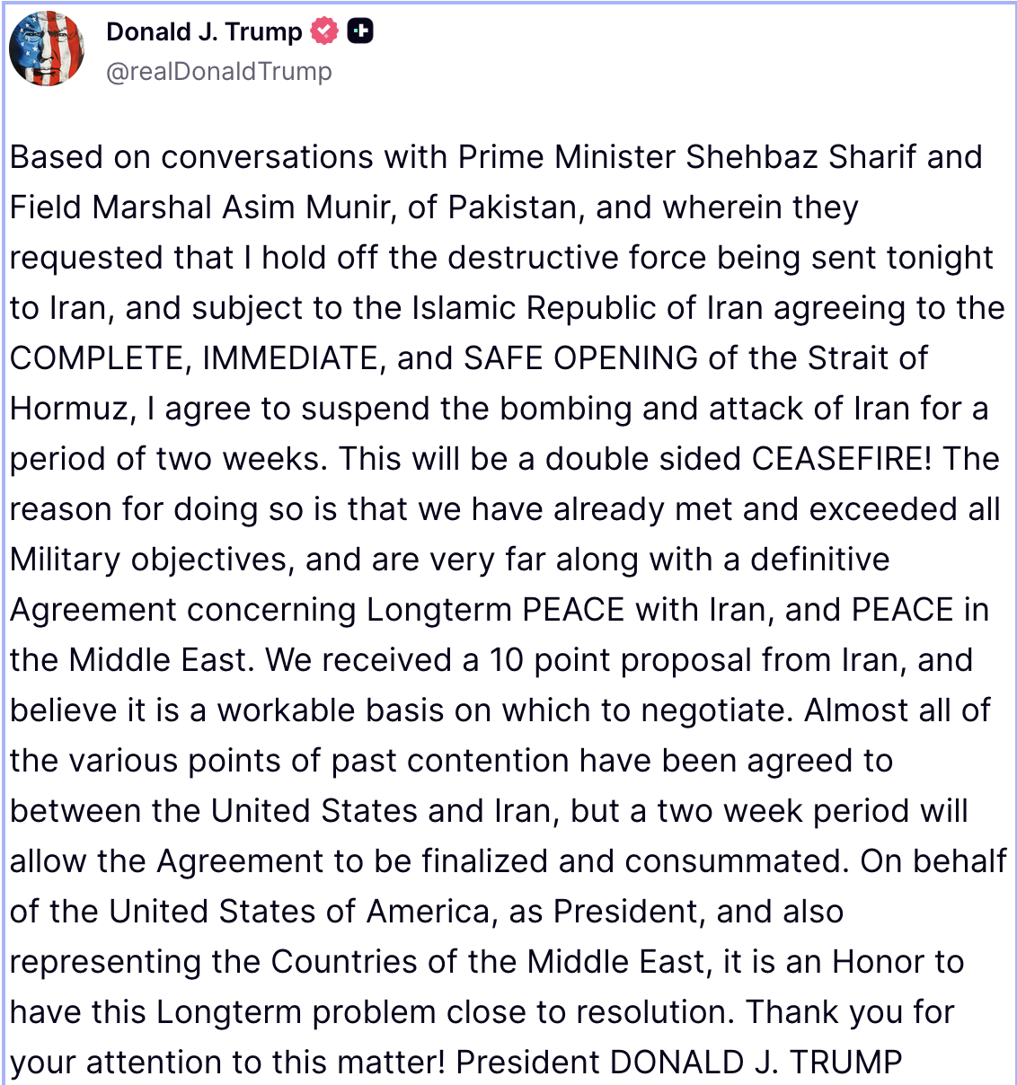Tras conversaciones con Pakistán, el presidente de los Estados Unidos anuncia que suspenderá ataques contra Irán durante dos semanas, siempre y cuando se abra el estrecho de Ormuz en ese período
