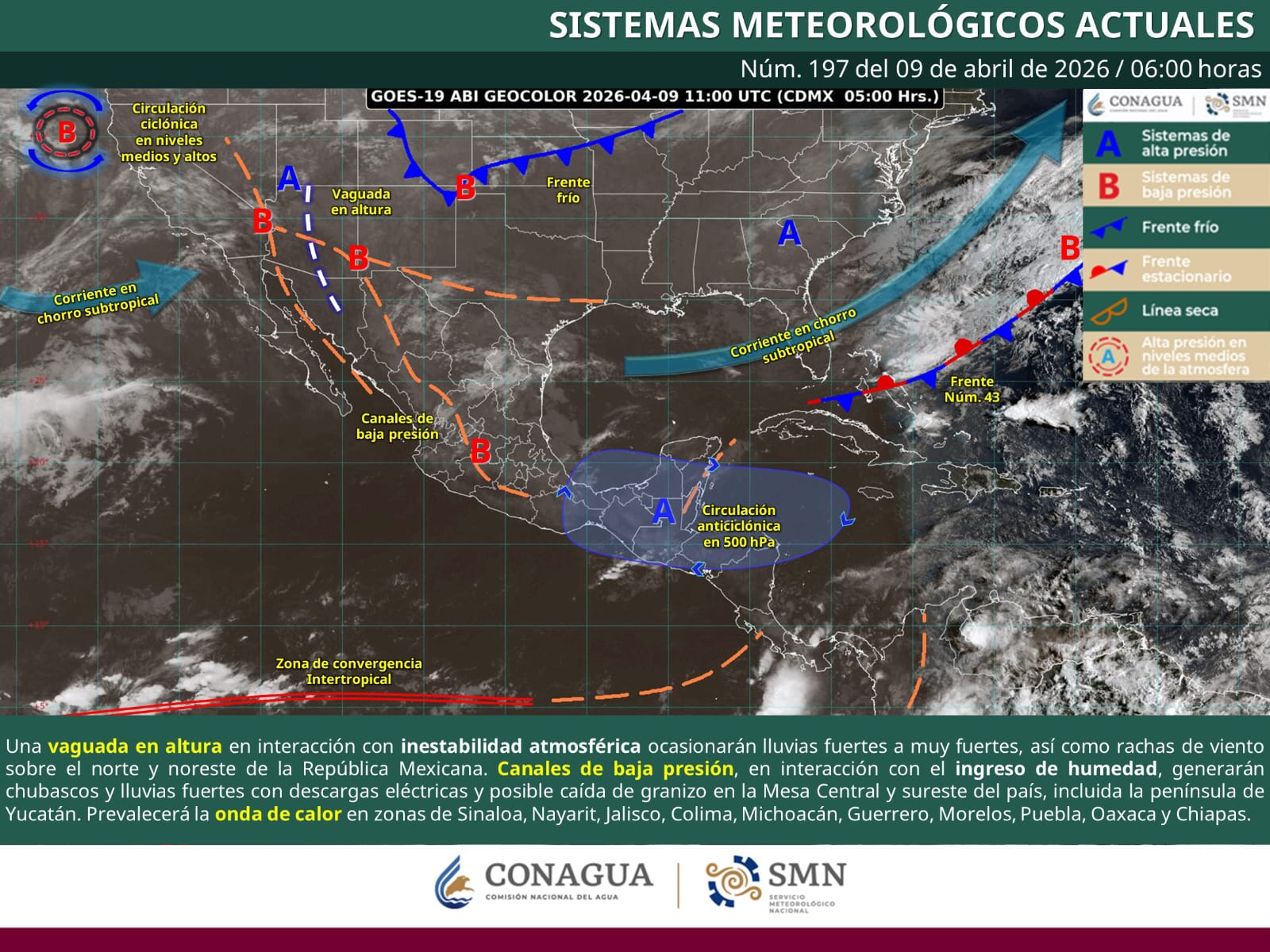 De acuerdo con el Servicio Meteorológico Nacional, se estiman acumulaciones de lluvia de 50 a 75 mm, acompañadas de vientos con rachas de 40 a 60 km/h y posibles tolvaneras.