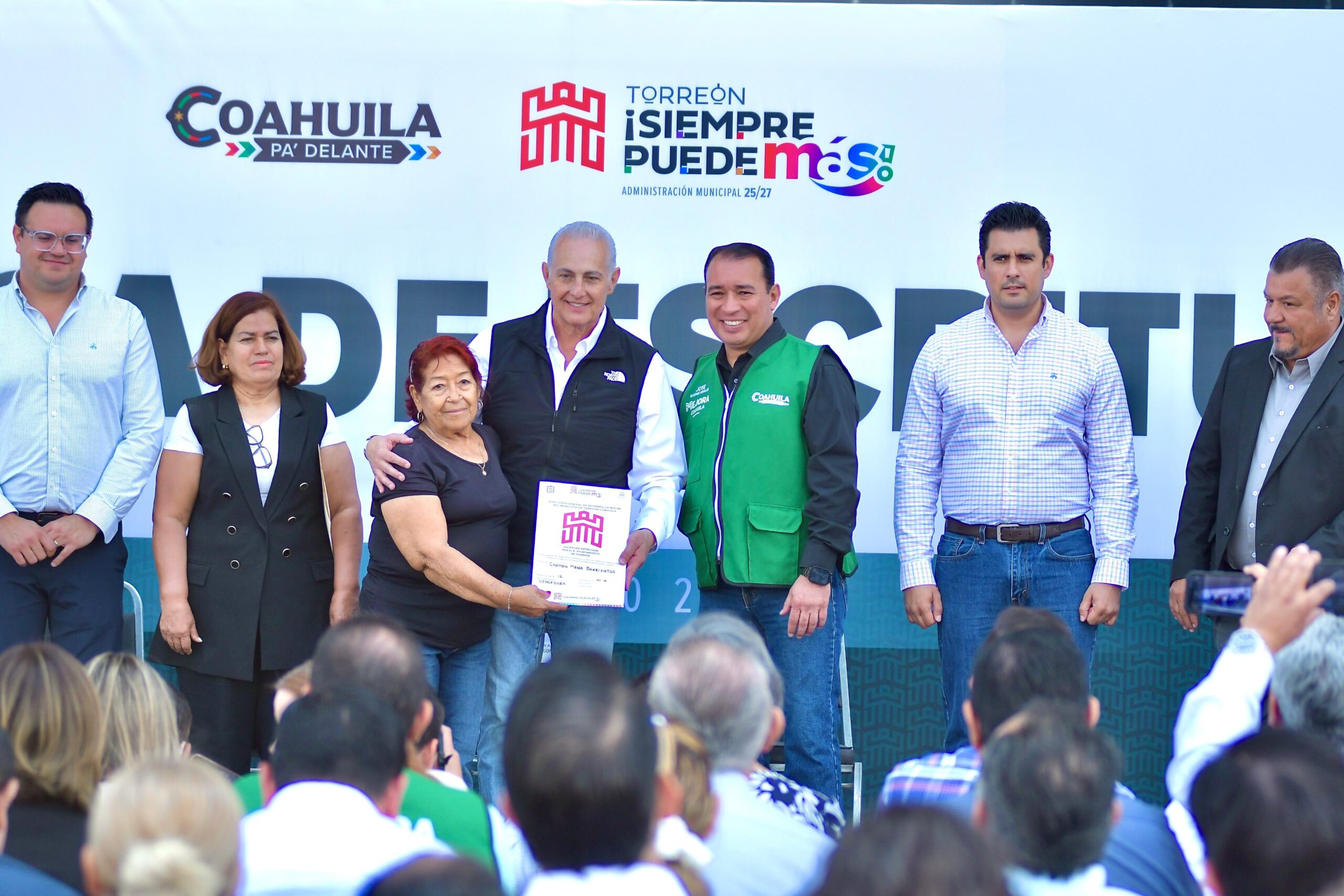 De igual forma, a nombre de las familias beneficiadas, María Eduviges Alvarado Ibarra, agradeció al alcalde Román Alberto Cepeda González por el programa que les brinda certeza patrimonial. “Gracias por hacer esto posible, por voltear a vernos, escucharnos y apoyarnos en algo tan importante para nosotros. Torreón sigue creciendo más cerca de su gente, con mejores servicios y avanzando con fuerza y seguridad”.