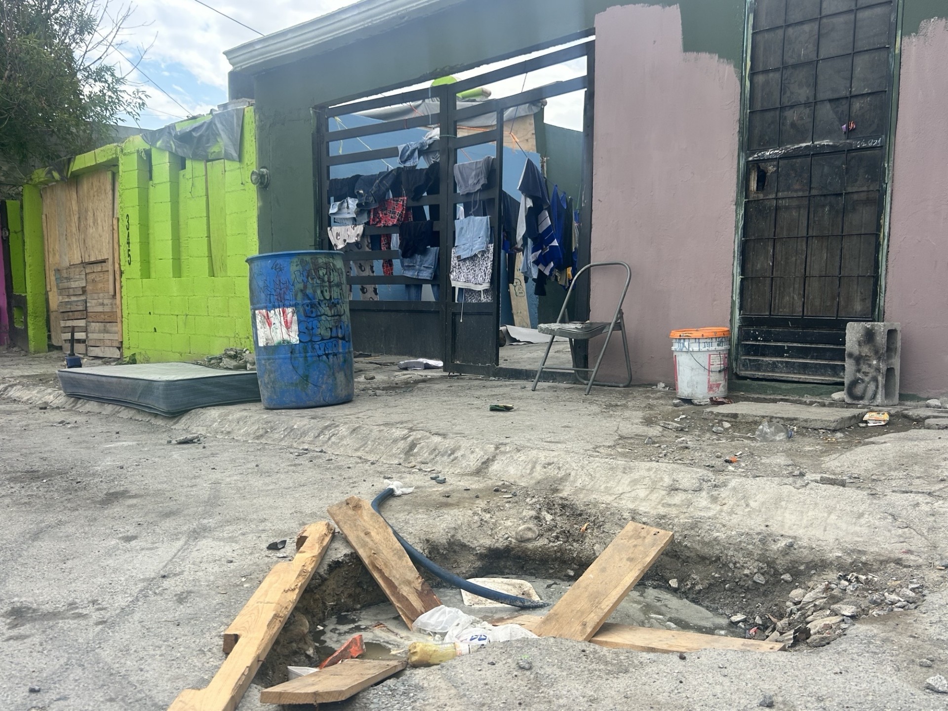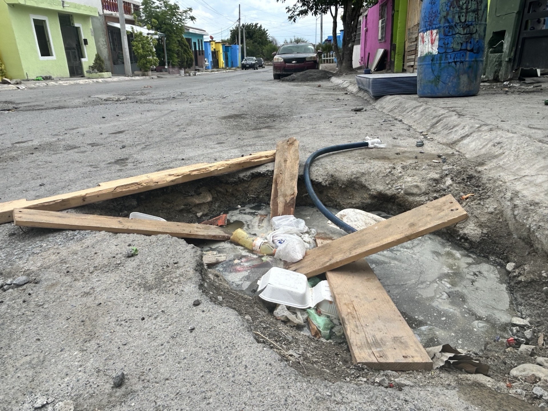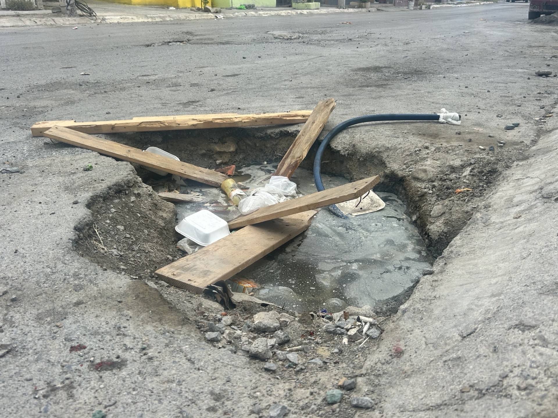 El punto afectado ha sido señalizado de manera improvisada con madera colocada por los propios habitantes, con el fin de hacerlo visible a distancia y evitar accidentes. Sin embargo, en el interior del hundimiento se ha acumulado agua estancada, lo que ha generado humedad constante y un debilitamiento progresivo del área.