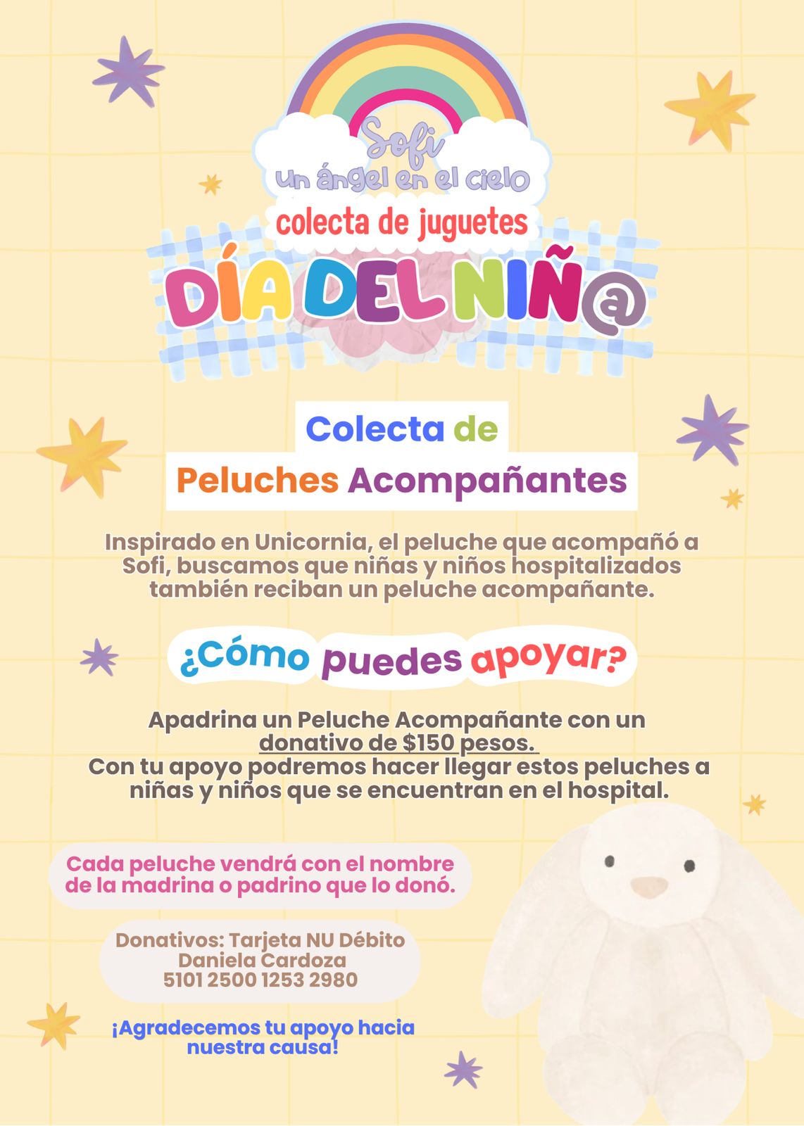“Estamos teniendo nuestra colecta de peluches acompañantes, esta es una colecta que llevamos haciendo desde hace varios años, en donde, además del juguetito, les damos un peluchito que cumple la función de acompañar a los niños en su internamiento como una figura de apego emocional”, compartió.