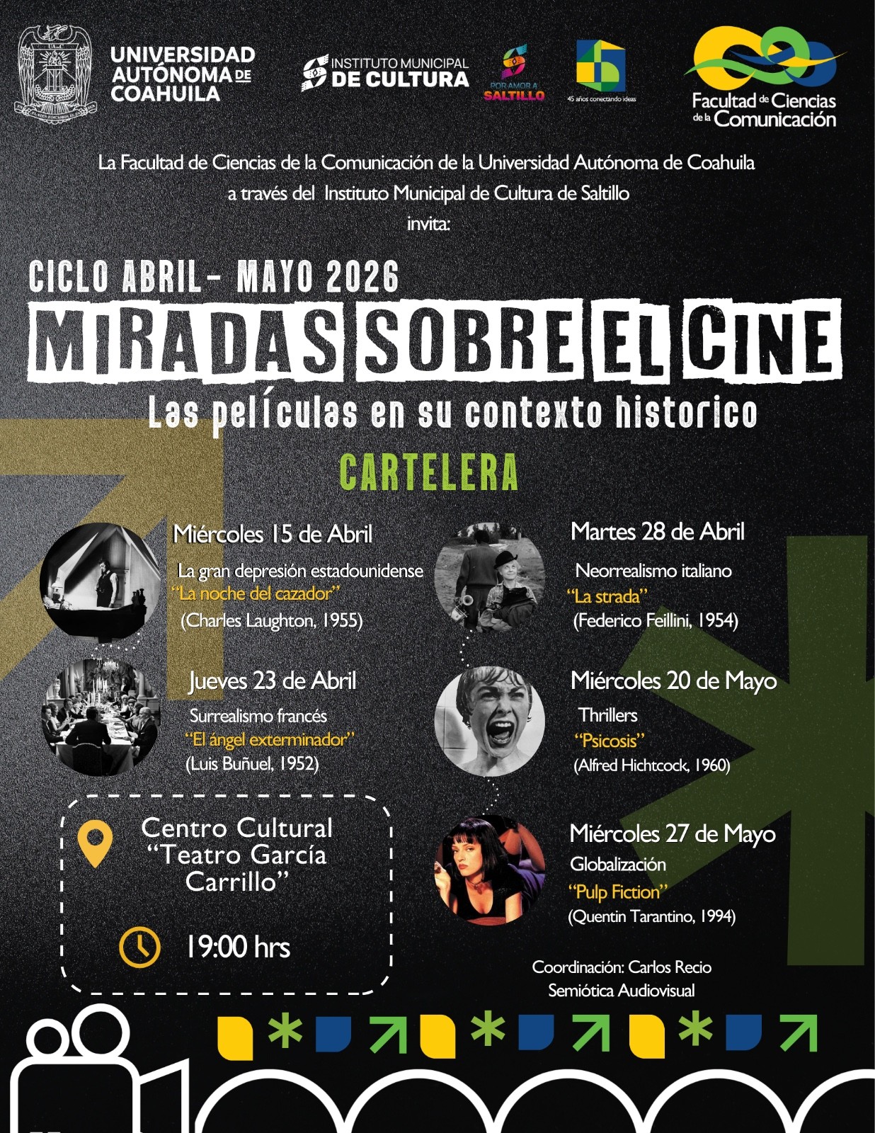 La Facultad de Ciencias de la Comunicación de la Universidad Autónoma de Coahuila (UA de C), en coordinación con el Instituto Municipal de Cultura de Saltillo (IMCS), presentará el ciclo «Miradas sobre el Cine: Las películas en su contexto histórico», que se llevará a cabo durante abril y mayo de este 2026, con entrada libre para el público en general.