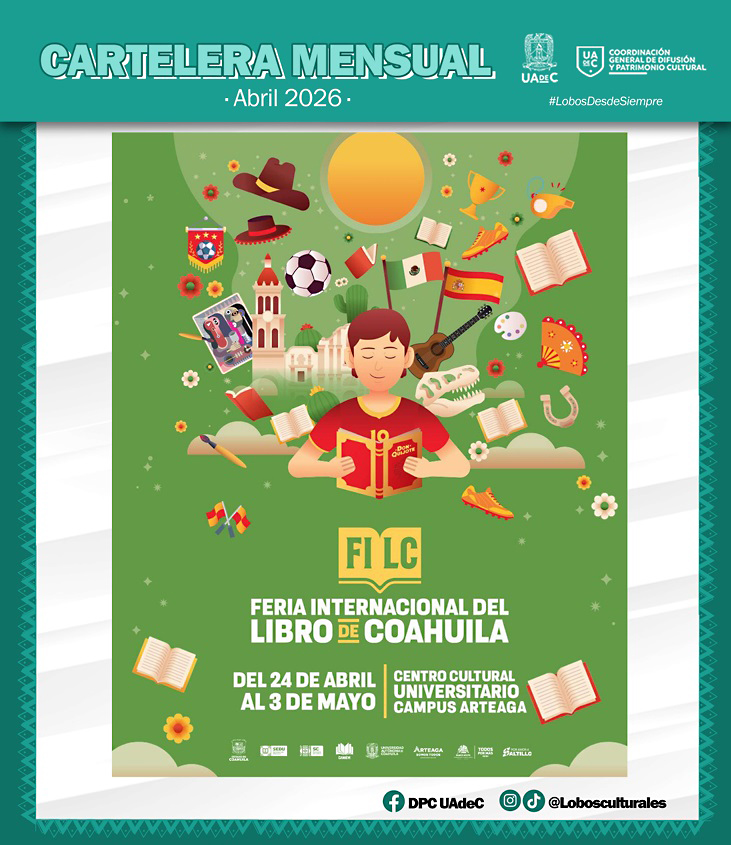 Arteaga, Coahuila.- La Universidad Autónoma de Coahuila, a través de la Coordinación General de Difusión y Patrimonio Cultural, da a conocer su participación en la Feria Internacional del Libro Coahuila (FILC) 2026, que se llevará a cabo del 24 de abril al 3 de mayo en el Centro Cultural Universitario de Arteaga, con una variada cartelera de actividades académicas, artísticas y literarias.