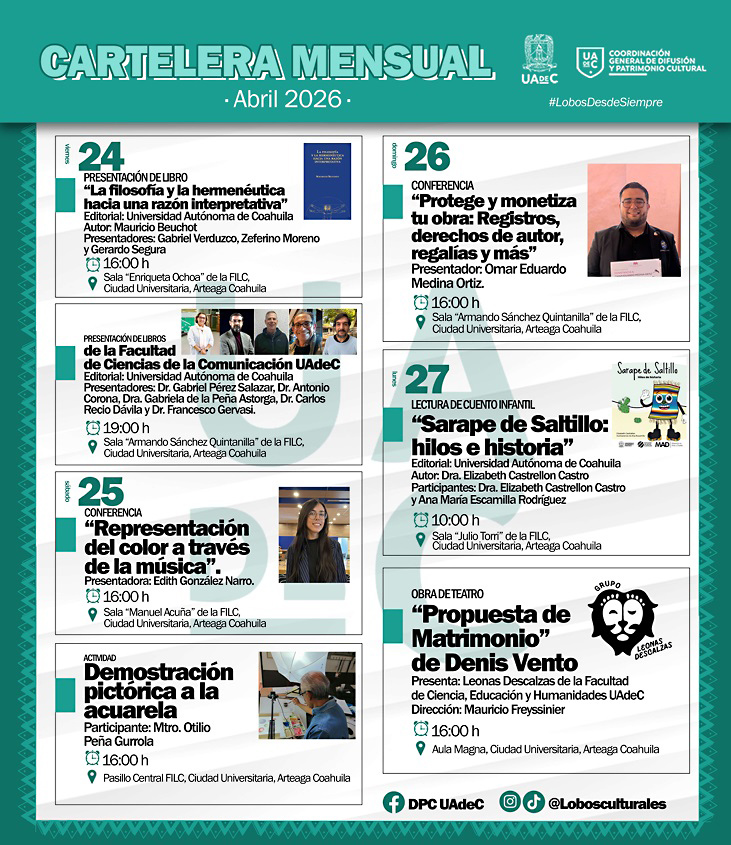 Las actividades inician el 24 de abril de 2026 a las 16:00 horas en la Sala “Enriqueta Ochoa” se realizará la presentación del libro “La filosofía y la hermenéutica hacia una razón interpretativa”, del autor Mauricio Beuchot; asimismo a las 19:00 horas la Facultad de Ciencias de la Comunicación presentará diversas obras editoriales en la Sala “Armando Sánchez Quintanilla”, con la intervención de académicos e investigadores de la UA de C, Gabriel Pérez Salazar, Antonio Corona, Gabriela de la PEÑA, Carlos Recio Ávila y Francesco Gervasi.