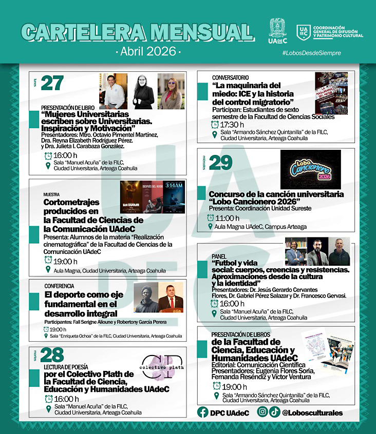 Mientras que el 29 de abril a las 11:00horas en el Aula Magna, se llevará a cabo el Concurso de la canción universitaria “Lobo Cancionero 2026”, organizado por la Coordinación de Unidad Sureste; a las 16:00 horas el Panel “Futbol y vida social: cuerpos, creencias y resistencias. Aproximaciones desde la cultura y la identidad”, a cargo de los presentadores Dr. Jesús Gerardo Cervantes Flores, Dr. Gabriel Pérez Salazar y Dr. Francesco Gervasi, posteriormente a las 19:00 horas en Sala “Armando Sánchez Quintanilla”, será la Presentación de Libros de la Facultad de Ciencia, Educación y Humanidades.