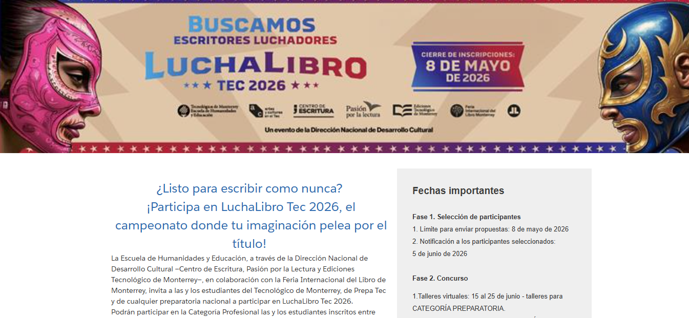 Monterrey, Nuevo León.- La Escuela de Humanidades y Educación (EHE) del Tecnológico de Monterrey, a través de la Dirección Nacional de Desarrollo Cultural —Centro de Escritura, Pasión por la Lectura y Ediciones Tecnológico de Monterrey—, en colaboración con la Feria Internacional del Libro de Monterrey, anunció la apertura de la convocatoria de LuchaLibro Tec 2026, una experiencia que coloca a las y los estudiantes en el centro de una competencia creativa única en su tipo.