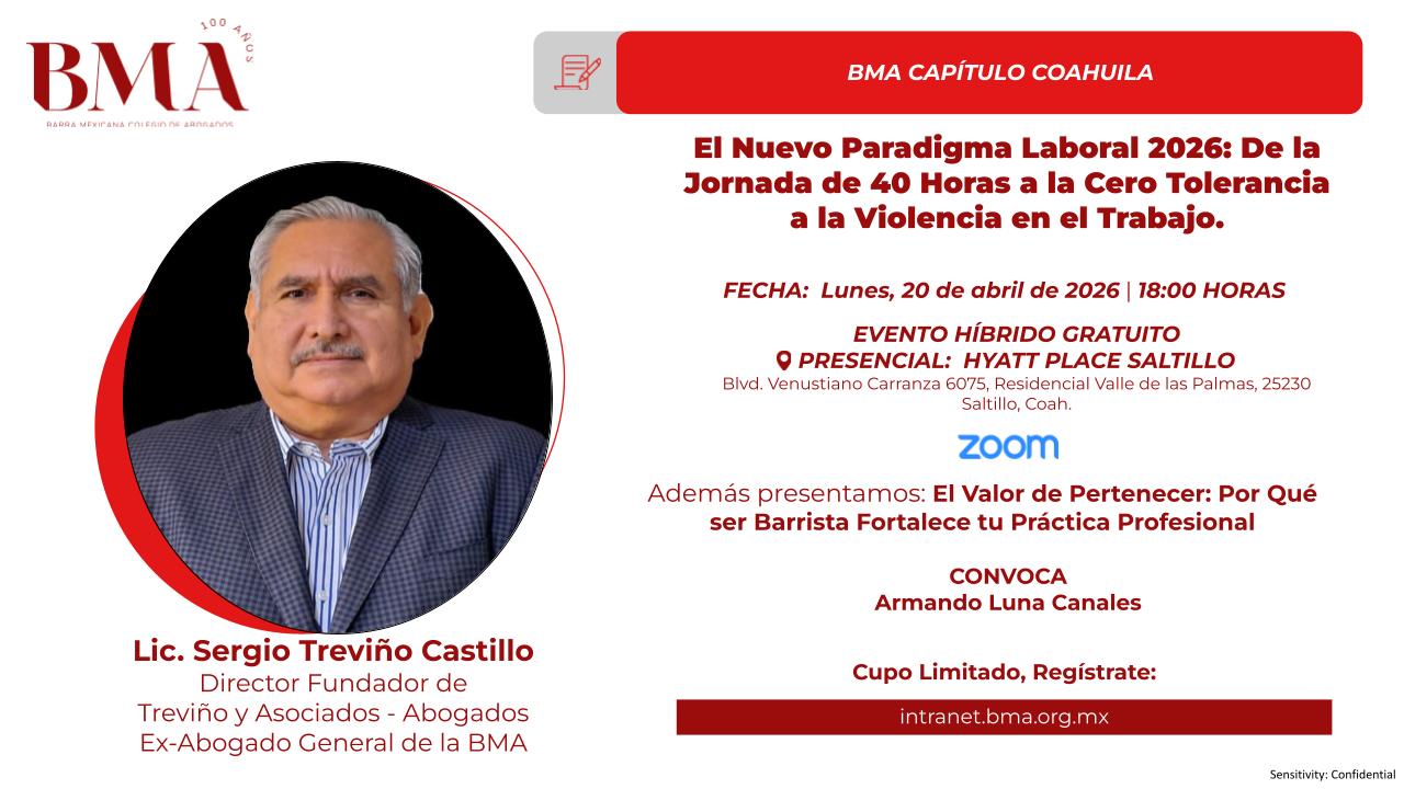 El Capítulo Coahuila de la Barra Mexicana de Abogados (BMA) llevará a cabo en esta capital el evento denominado “El nuevo paradigma laboral 2026, de la jornada de 40 horas a la Cero Tolerancia a la Violencia en el Trabajo”.