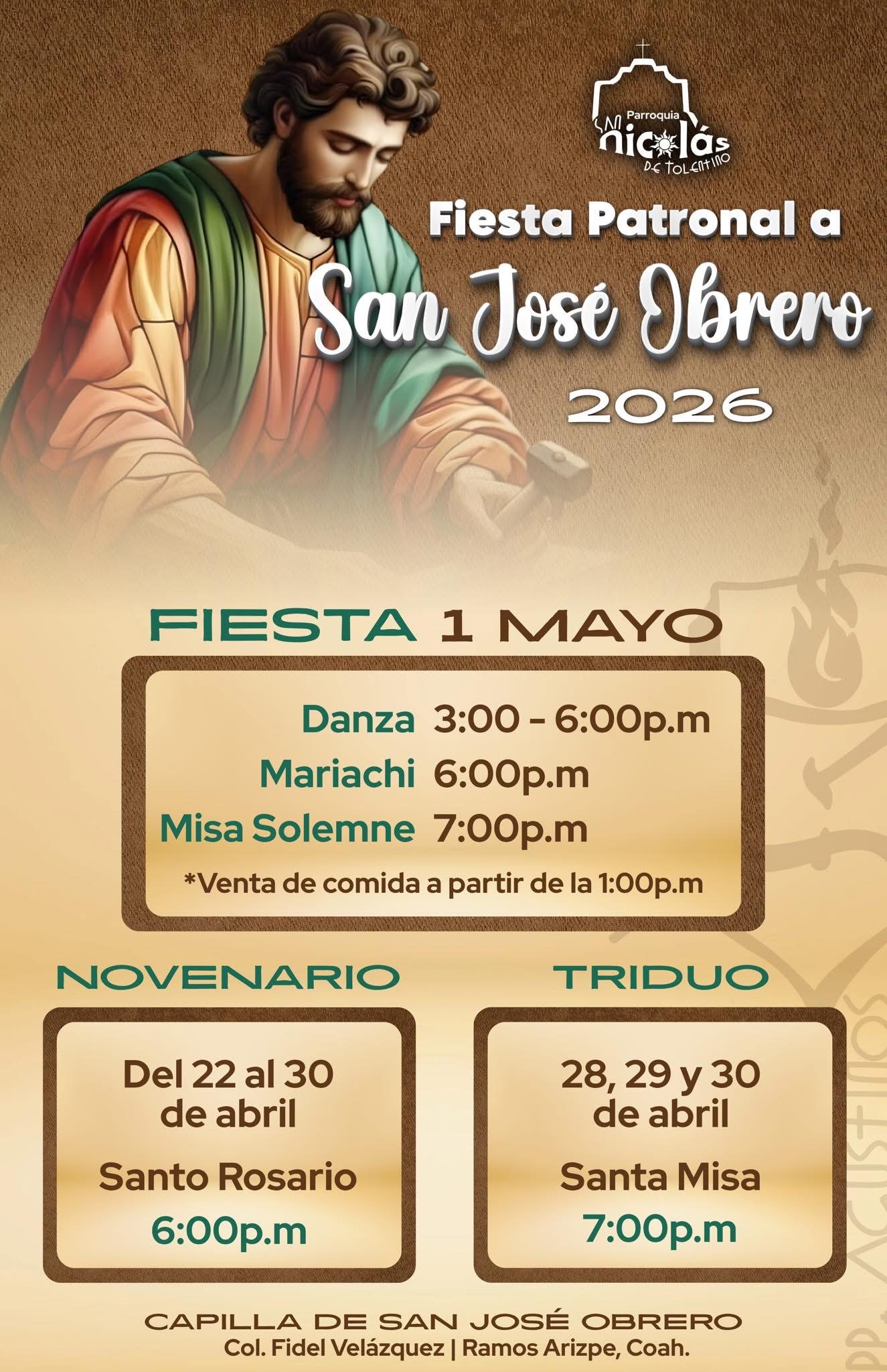 La Parroquia San Nicolás de Tolentino en Ramos Arizpe lanzó una invitación a la comunidad para participar en la fiesta patronal en honor a San José Obrero, celebración religiosa y familiar que se realizará en la capilla ubicada en la colonia Fidel Velázquez durante los últimos días de abril y el primero de mayo.