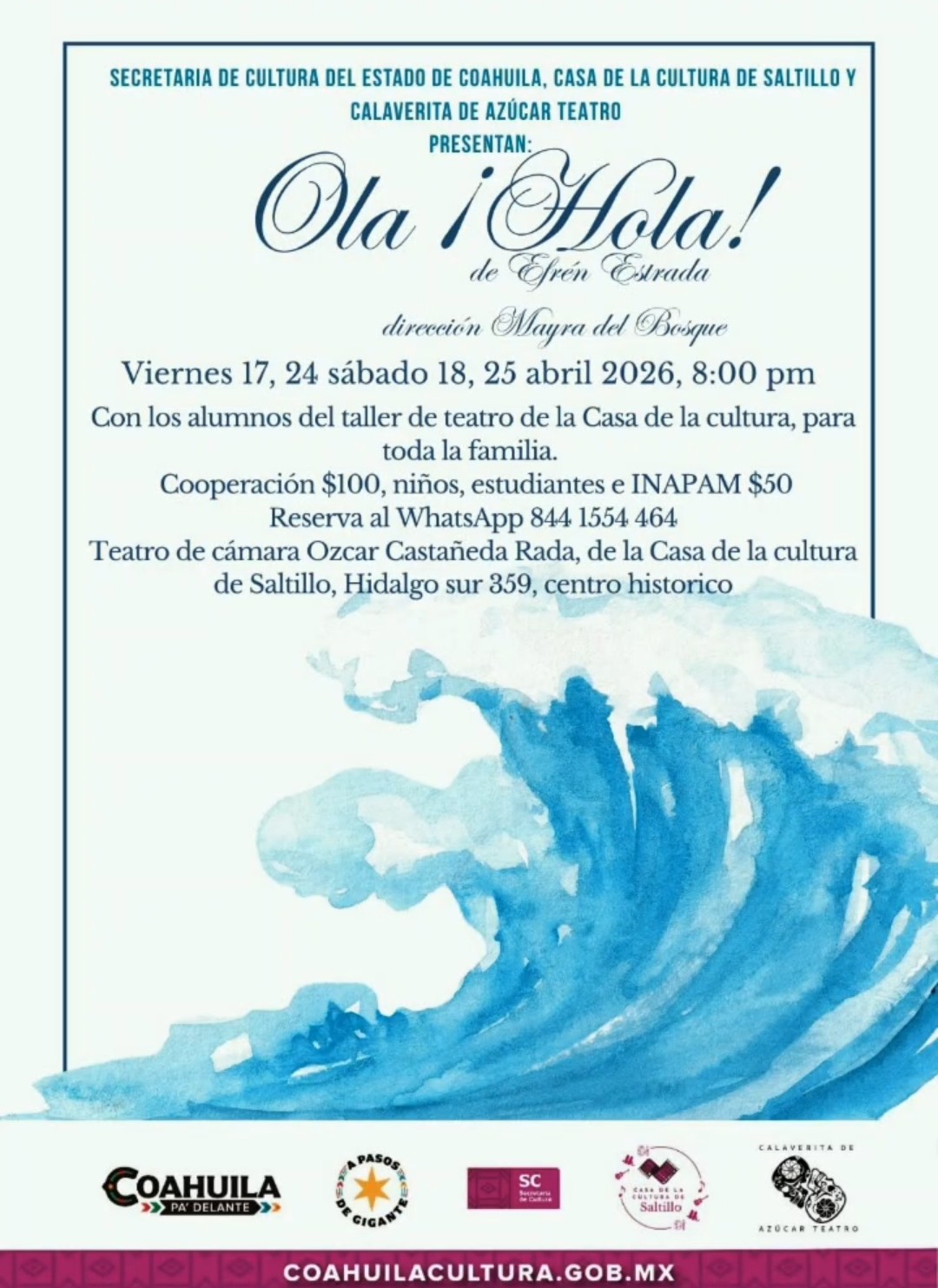 La puesta en escena «Ola, ¡Hola!» llegará a Saltillo con funciones programadas para los próximos 24 y 25 de abril de este 2026, a las 8:00 de la noche, en el Teatro de Cámara «Ozcar Castañeda Rada», ubicado al interior de la Casa de Cultura de Saltillo.