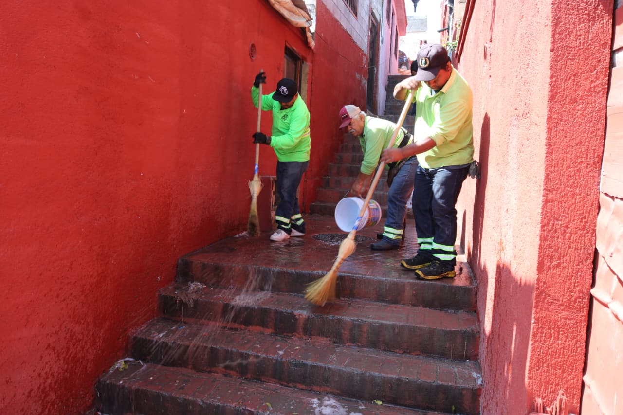 Asimismo, cuadrillas de la Dirección de Distrito Centro, así como del programa “Aquí Andamos”, llevaron a cabo una jornada de limpieza profunda y atención al emblemático Callejón del Beso, así como a sus alrededores, a fin de fortalecer la identidad saltillense y el entramado social.