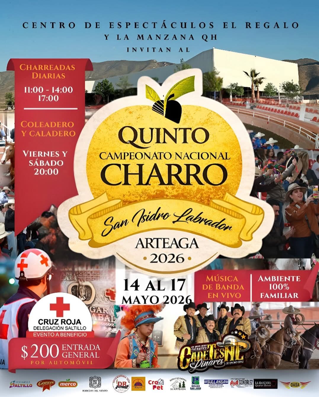 Los días del 14 al 17 de mayo tendrán lugar en el centro de espectáculos El Regalo de la vecina población de Arteaga las actividades del Quinto Campeonato Nacional Charro “San Isidro Labrador”, el cual será a beneficio de la Cruz Roja Delegación Saltillo y contará con la participación de destacados exponentes en el deporte nacional de la charrería.