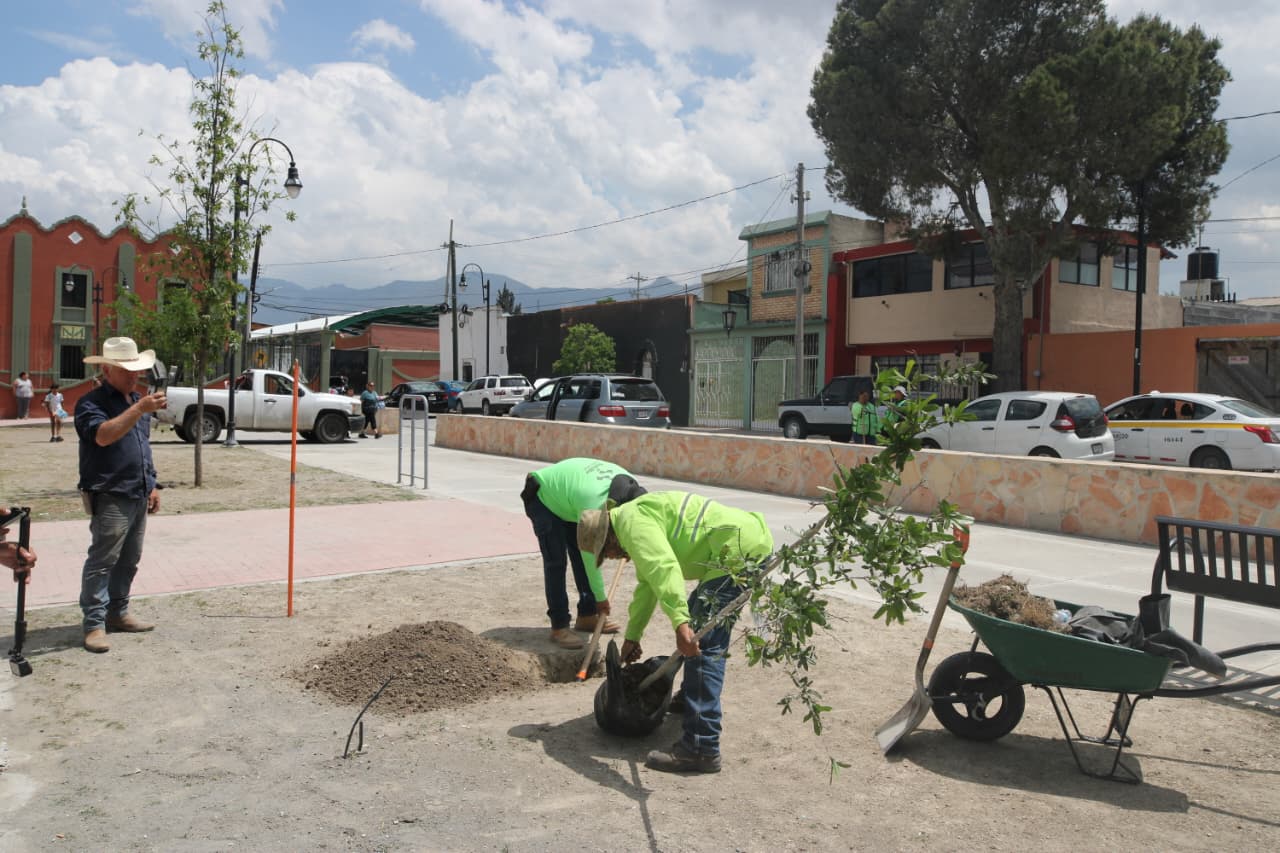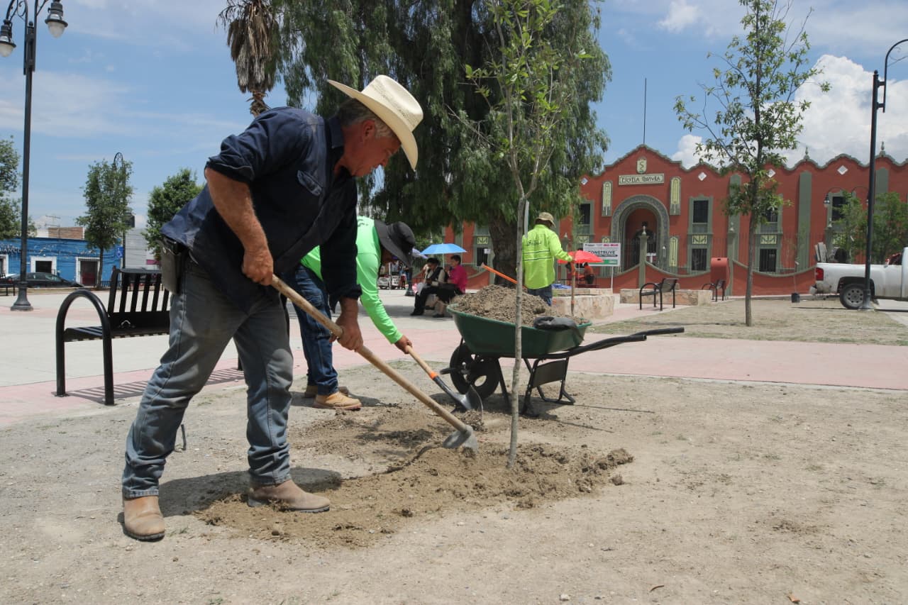 Además, se refuerzan las labores de reforestación con arbolado de la especie encino siempre verde en las diferentes áreas de la plaza pública Coahuila, en la Zona Centro de Saltillo.