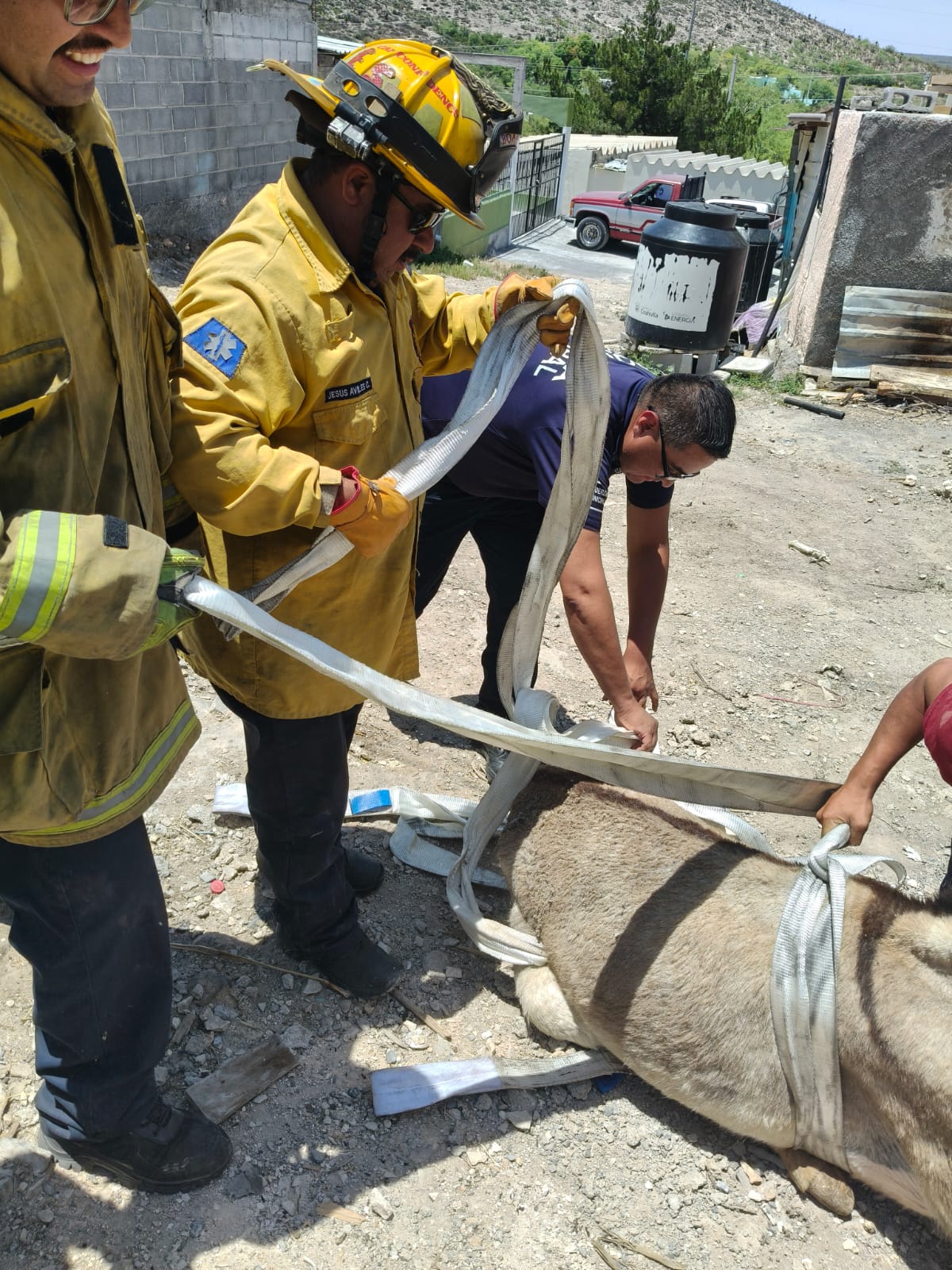 Elementos del Cuerpo de Bomberos de Saltillo, con el apoyo de vecinos del ejido Guadalupe Victoria, realizaron con éxito el rescate de un animal que se encontraba en situación de riesgo.