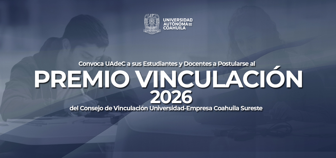 La Universidad Autónoma de Coahuila al pertenecer al Consejo de Vinculación Universidad-Empresa Coahuila Sureste, convoca a sus estudiantes y docentes a postularse al Premio Vinculación 2026 con fecha límite el 1 de mayo, con el que se reconoce el desempeño académico, el compromiso social, las actividades de vinculación, la calidad humana de estudiantes y docentes de las Instituciones de Educación Superior pertenecientes al Consejo.