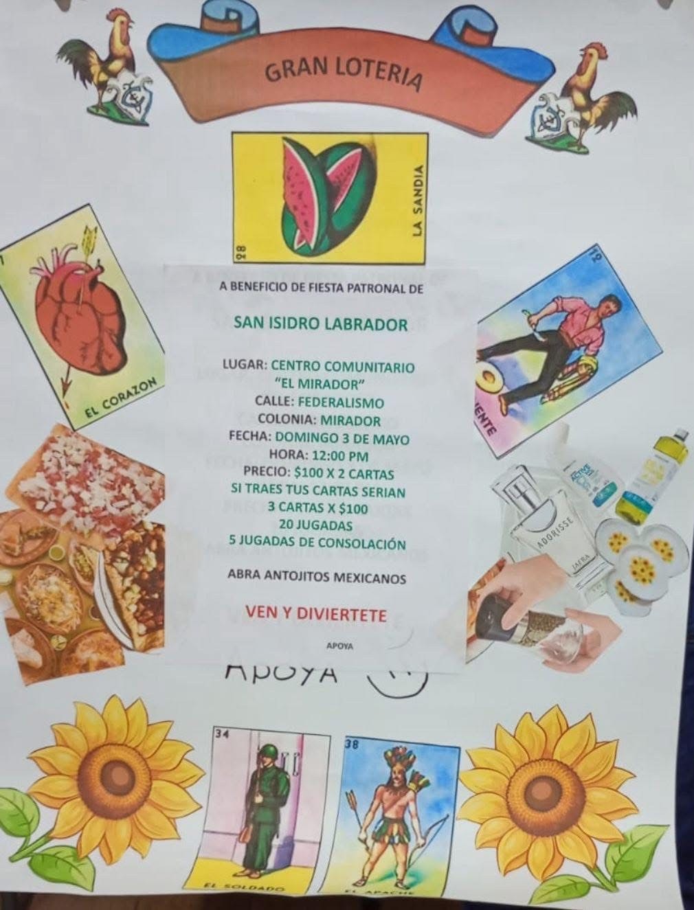 Como parte de esta preparación, se llevará a cabo una lotería el próximo domingo 3 de mayo a las 12:00 del mediodía, en el centro comunitario de la colonia El Mirador, ubicado frente a la capilla dedicada a este santo, en la calle Federalismo #1280.