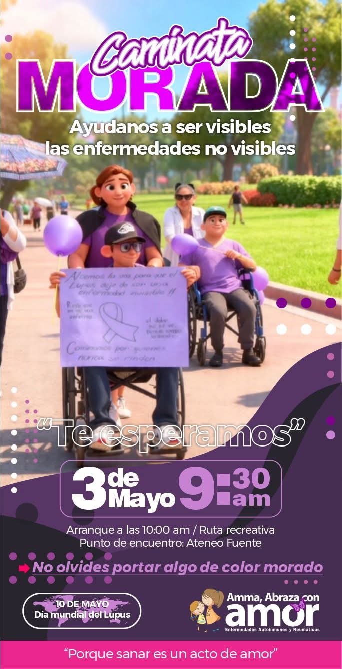 La presidenta de la fundación Abraza con Amor AC (AMMA), Aída Barrera Enciso, dio a conocer que este domingo 3 de mayo tendrá lugar en la Ruta Recreativa la “Caminata Morada”, actividad cuyo objetivo es el de visibilizar la lucha que diariamente protagonizan los pacientes diagnosticados con lupus y otras enfermedades autoinmunes, tanto en Coahuila como en todo el país.