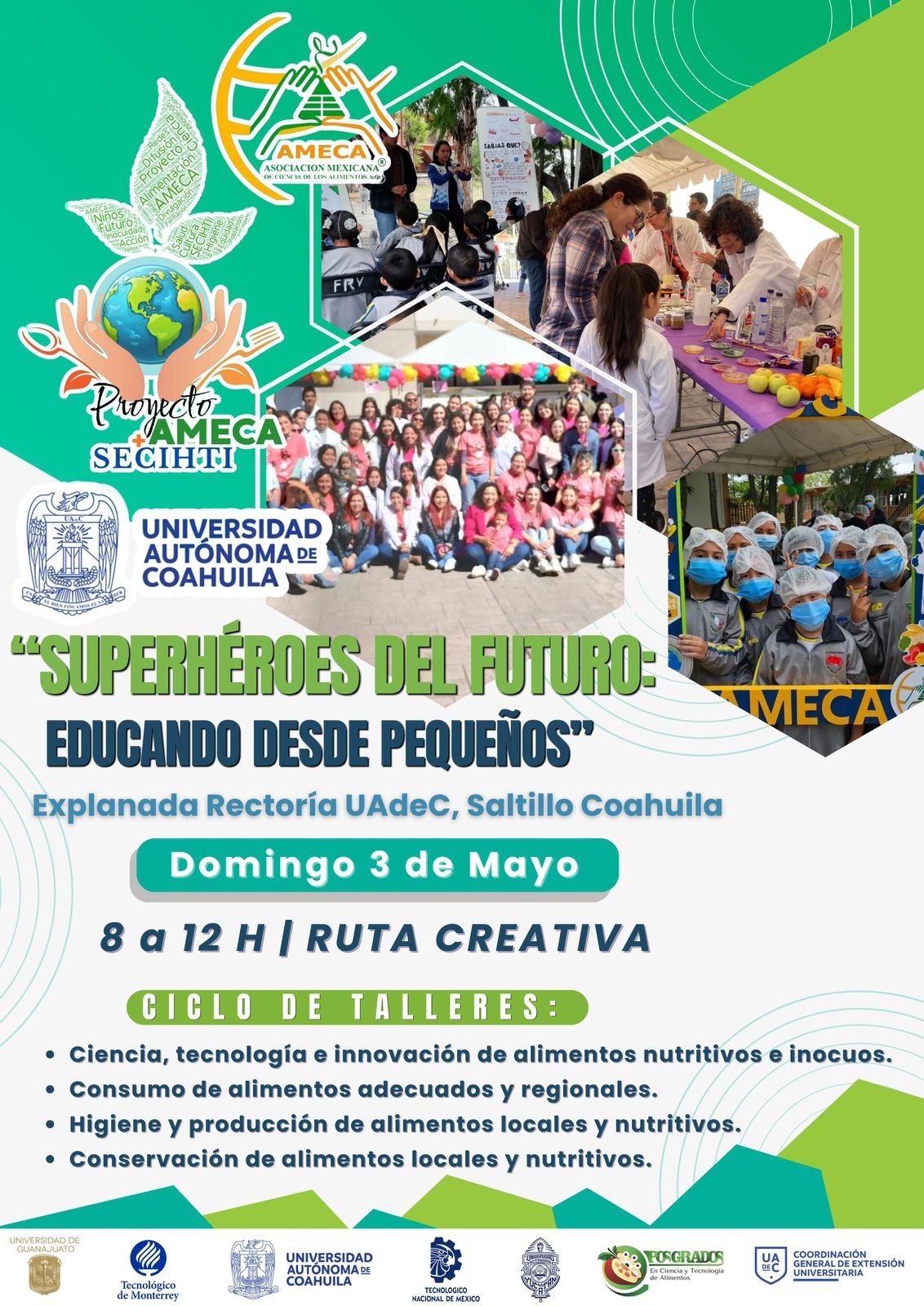 La Universidad Autónoma de Coahuila, a través de la Coordinación de Extensión Universitaria y la Facultad de Ciencias Químicas (FCQ) y en coordinación con la Asociación Mexicana de Ciencia de los Alimentos (AMECA), llevará a cabo el evento “Superhéroes del Futuro: Educando desde Pequeños”, una jornada dirigida a niñas, niños y sus familias el próximo 3 de mayo de 8:00 a 12:00 horas, en la explanada de Rectoría, en el marco de la Ruta Recreativa.