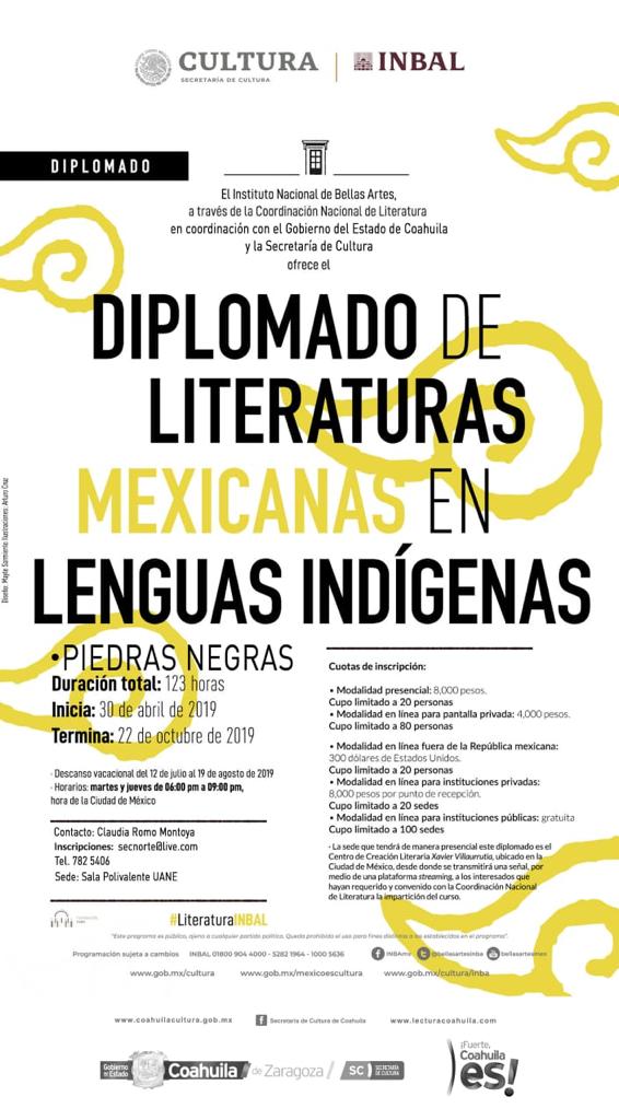 Piedras Negras.- A partir del 30 de abril, la Secretaría de Cultura de Coahuila (SC), en coordinación con el Instituto Nacional de Bellas Artes (INBA), llevará a cabo el Diplomado de Literaturas Mexicanas en Lenguas Indígenas en línea, en la Sala Polivalente de la Universidad Autónoma del Noreste de Piedras Negras, dirigido a todo el público y con valor curricular, informó Claudia de los Santos Amaya, coordinadora de la SC en la Región Norte.