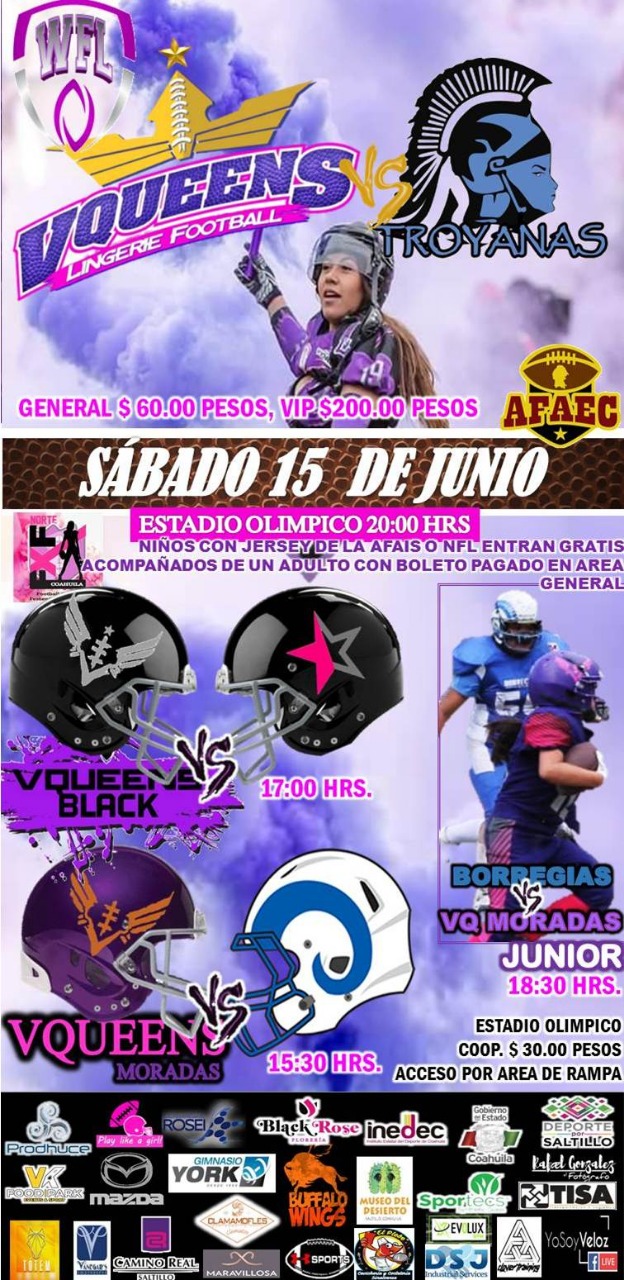 «El sábado 15 de junio tenemos una fiesta dentro de la familia VQueens, ya que movimos todo para que coincidiéramos con la fecha del juego de bikini para que nuestros equipos, en las categorías juveniles e infantil, pudieran jugar el mismo día en el estadio y hacer un evento de futbol americano femenil donde todas las familias pueden ir a disfrutarlo», dijo para El Heraldo, Luis Salas, gerente deportivo de VQueens.