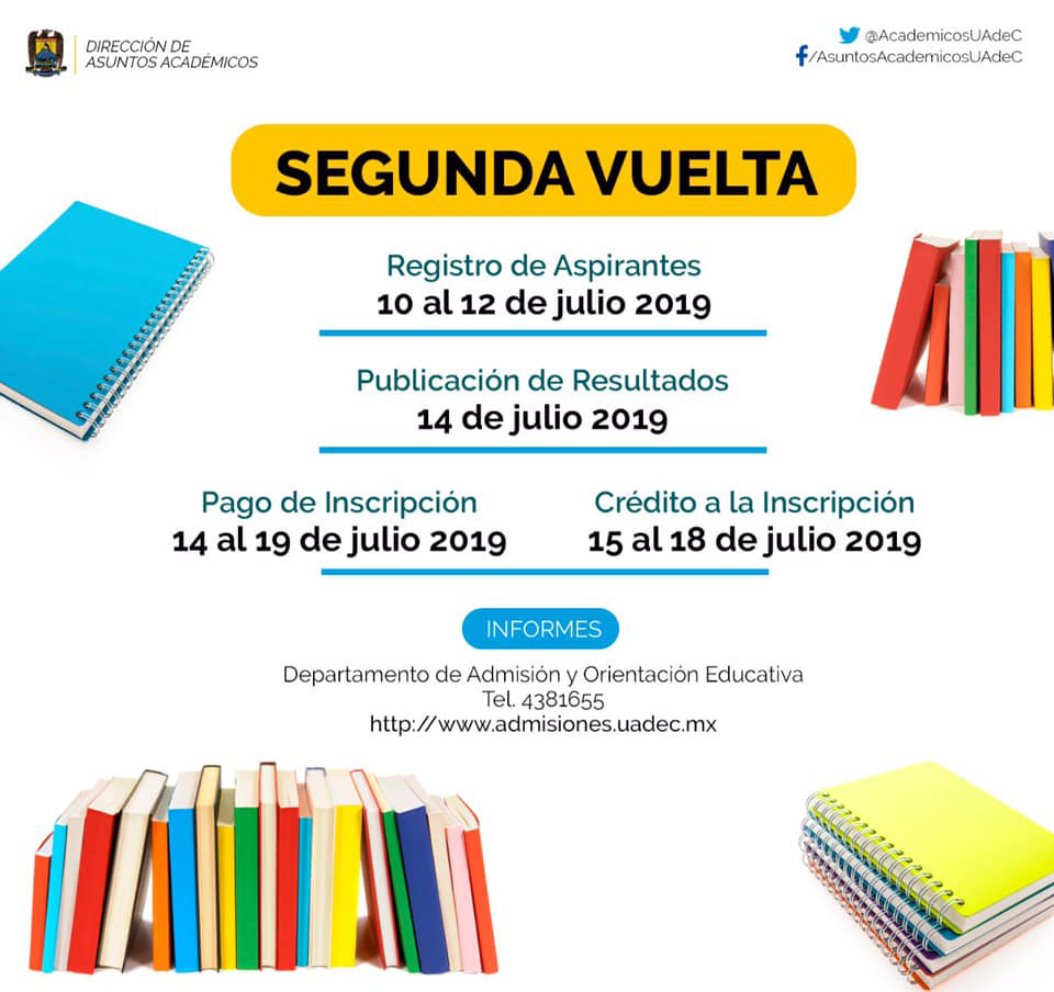 Para la segunda vuelta no se compra ficha ni se presenta examen, solo tienes que registrarte por internet en la páginawww.admisiones.uadec.mx en el «link» que dice registro (Se requiere número de ficha y número de registro).