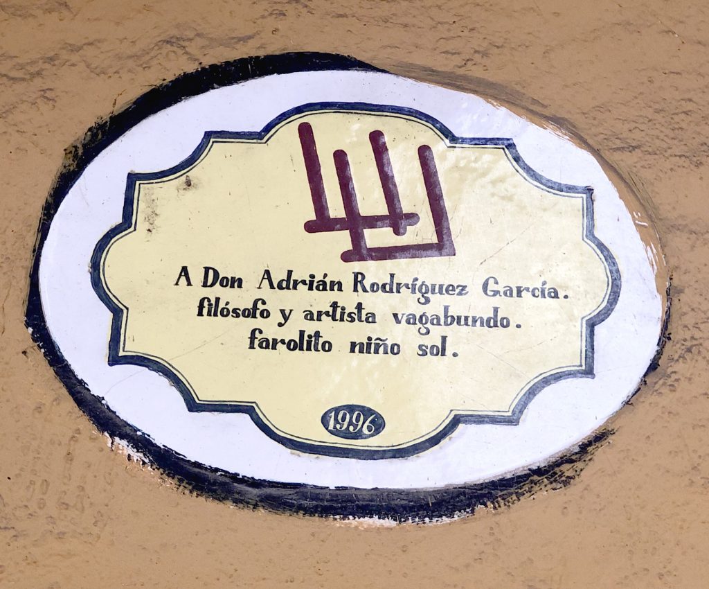 «A Don Adrián Rodríguez García, filósofo y artista vagabundo, farolito niño sol» (en honor a como solía firmar sus escritos), dicta la placa que permite a los transeúntes conocer su legado.