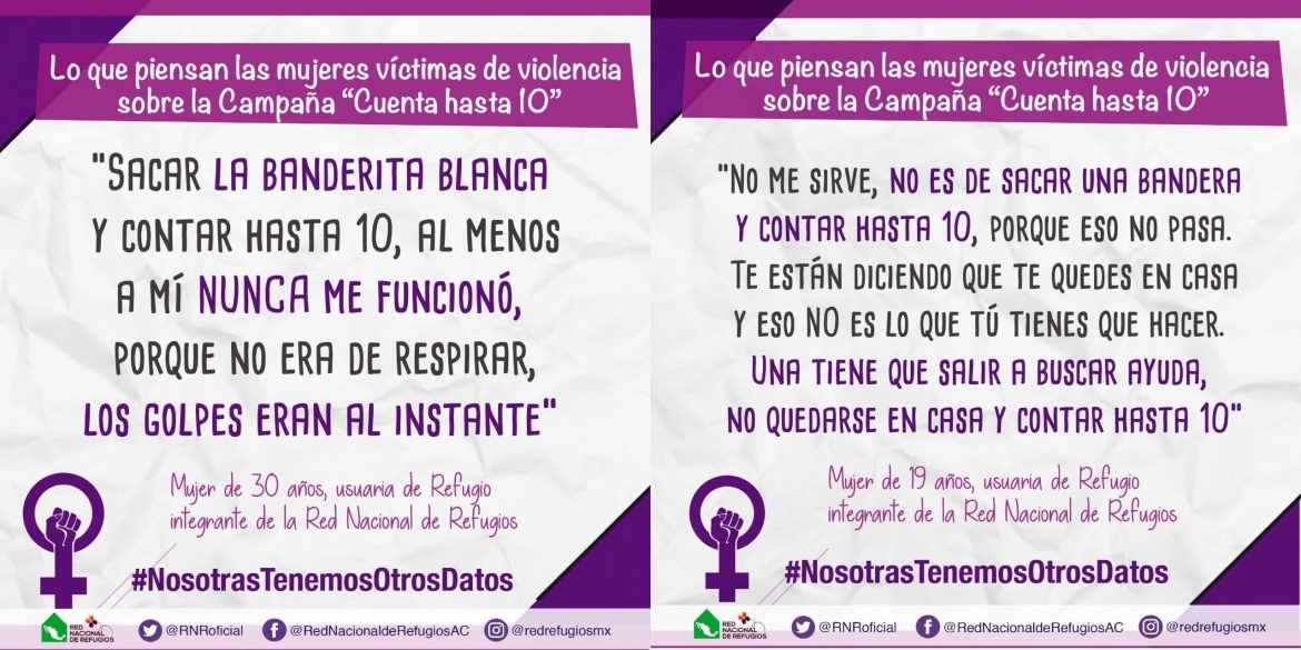 Las mujeres víctimas de violencia de la RNR coincidieron en un posicionamiento con respecto a esta campaña: “La campaña ‘Cuenta hasta 10’ invisibiliza la violencia contra las mujeres, promueve el silencio, carece de enfoque de género y Derechos Humanos. Omite la responsabilidad del gobierno en la defensa y protección de las mujeres”.