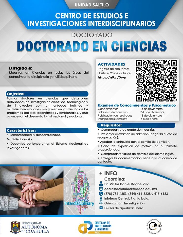 El Centro de Estudios e Investigaciones Interdisciplinarios CEII de la Universidad Autónoma de Coahuila convoca a Maestros en Ciencias de todas las áreas del conocimiento a cursar el Doctorado en Ciencias que tendrá apertura en enero de 2021.