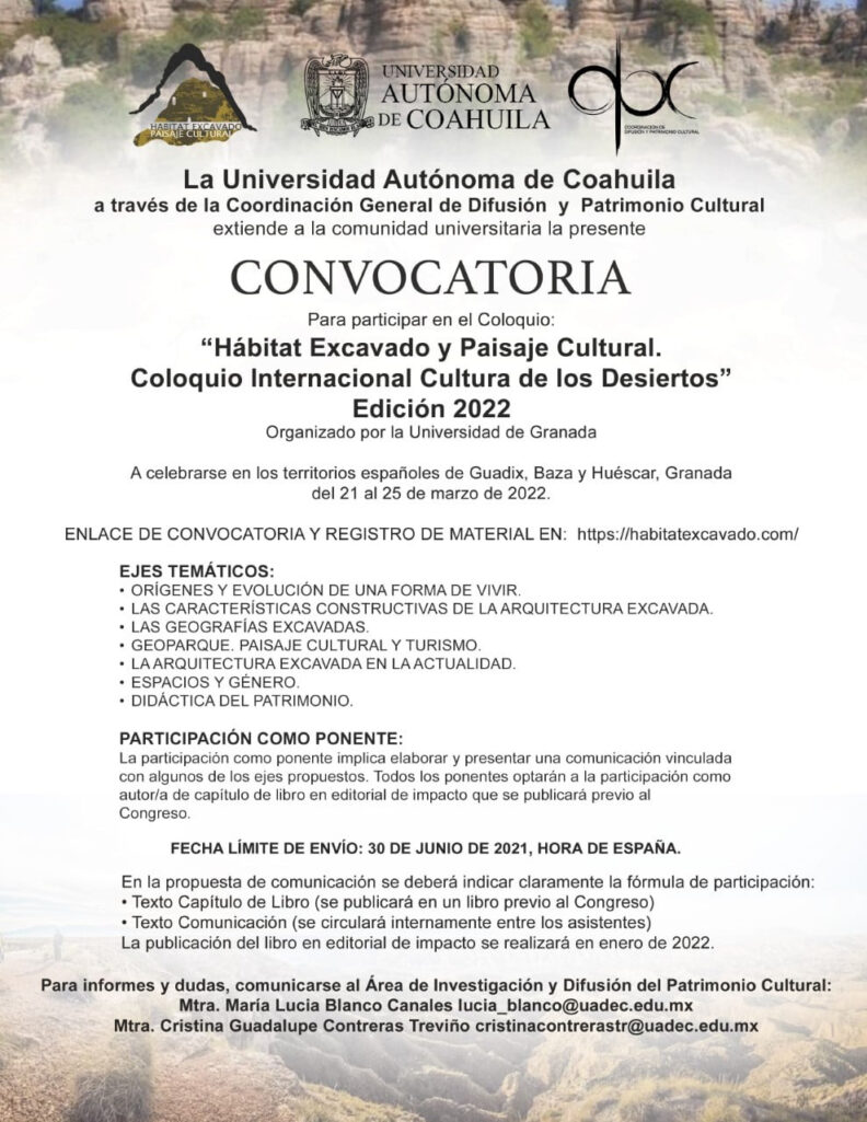 La Coordinación de Difusión y Patrimonio Cultural de la Universidad Autónoma de Coahuila, extiende a la comunidad universitaria la convocatoria para participar como ponentes en el Coloquio Internacional “Memoria de los Desiertos edición 2022” en el marco del Congreso “Hábitat Excavado y Paisaje Cultural”, el cual se llevará a cabo del 21 al 25 de marzo de 2022 en Granada, España.