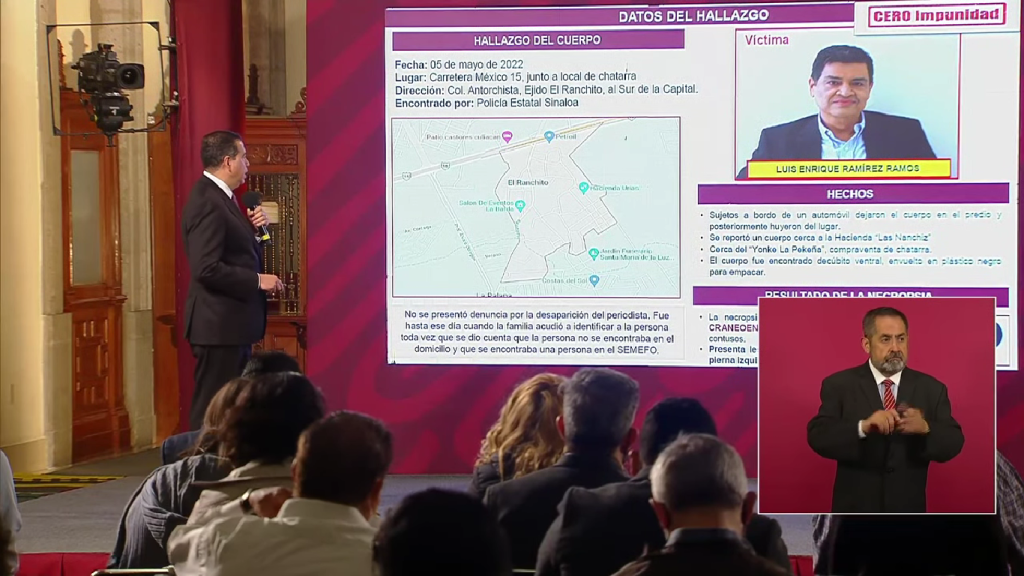 En Palacio Nacional, el subsecretario recordó que el periodista fue privado de la libertad el 4 de mayo y lo hallaron sin vida al día siguiente y señaló que Luis Enrique Ramírez no se había incorporado al Mecanismo de Protección de Periodistas que tiene la Secretaría de Gobernación (Segob).