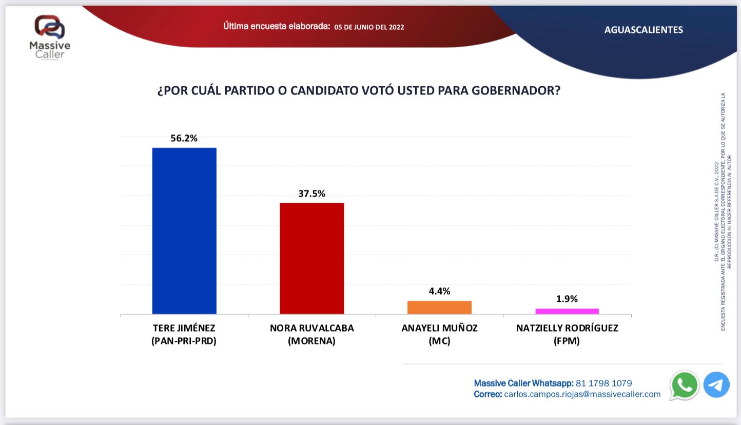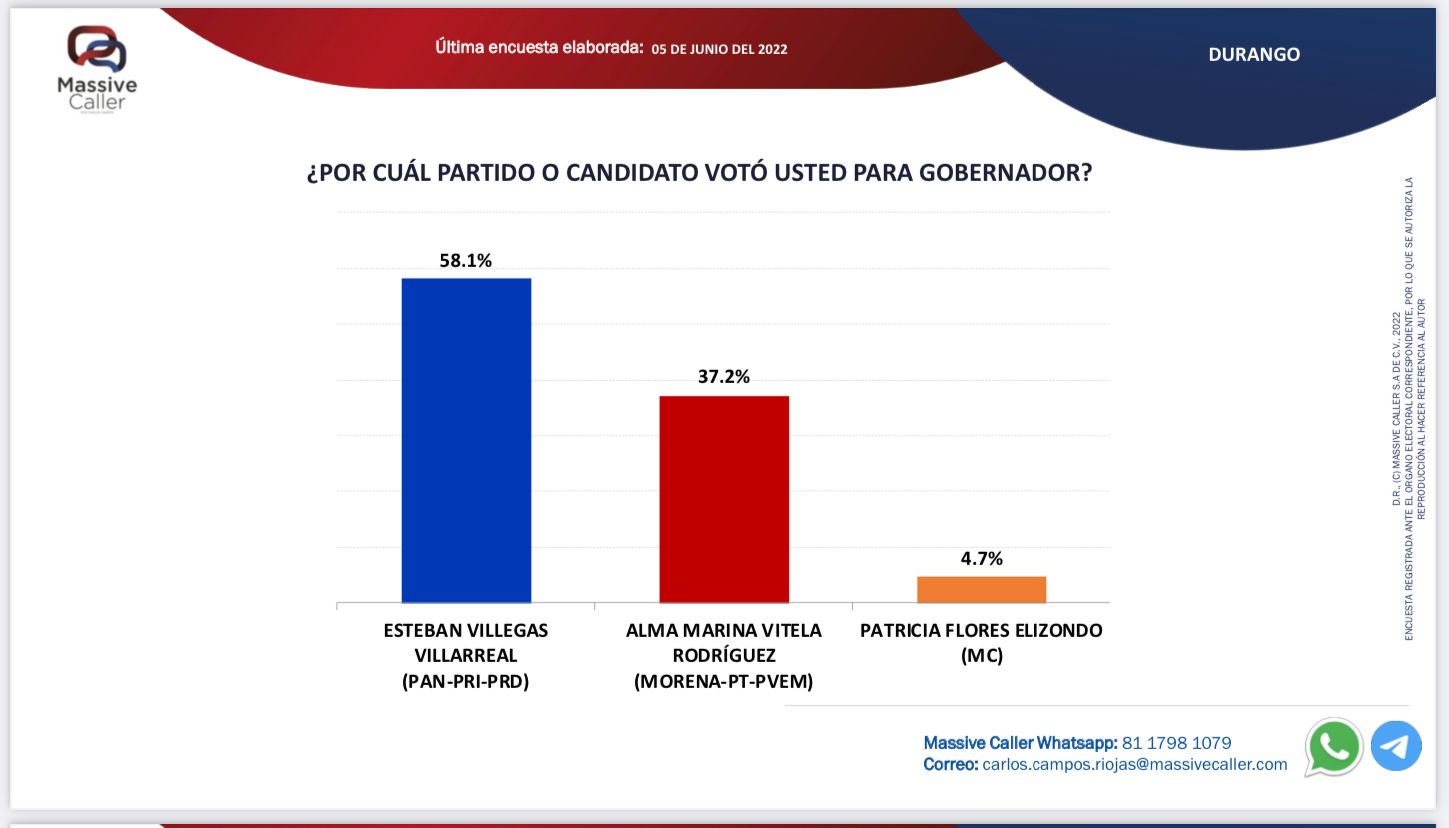 Por su parte, la Alianza PAN-PRI-PRD habría ganado en Aguascalientes, en donde Tere Jiménez vencería con aproximadamente el 56 por ciento de los votos a Nora Ruvalcaba de MORENA, que obtendría el 37%; y en Durango, Esteban Villegas se impondría con aproximadamente 58% de las preferencias contra 37% de Alma Vitela de MORENA.