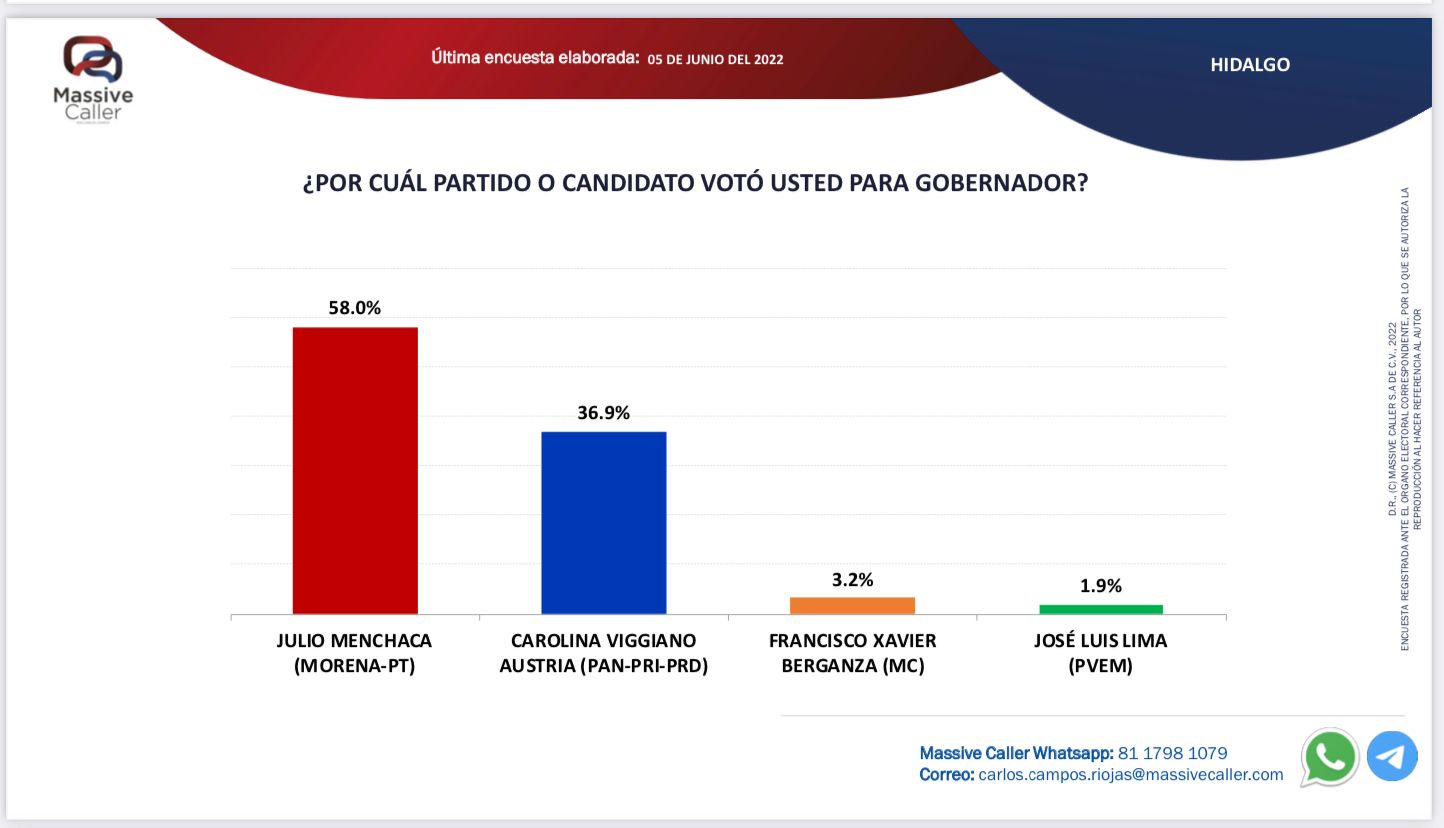 MORENA se levantaría con el triunfo en Hidalgo, venciendo Julio Menchaca con el 58 por ciento de votos a Carolina Viggiano del PAN-PRI-PRD que se quedó con el 36.9%.