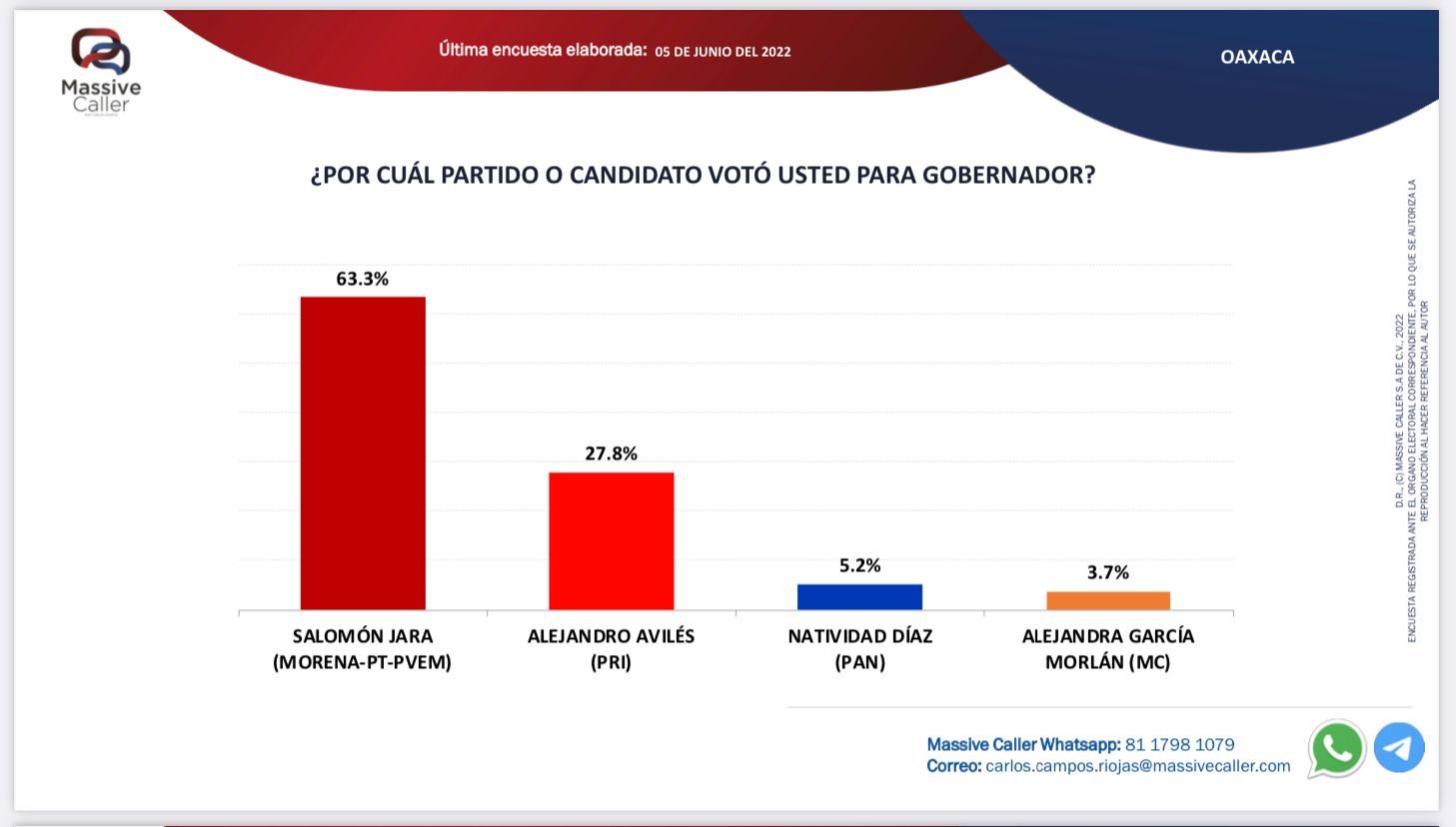 En Oaxaca el ganador sería Salomón Jara de MORENA con el 63.3% contra el 27.8% de Alejandro Avilés del PRI.