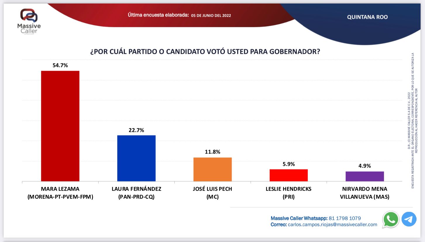En Quintana Roo, Mara Lezana de MORENA también habría ganado con el 54.7 por ciento contra Laura Fernández del PAN-PRD que se estima obtendrá el 22.7% de votos.