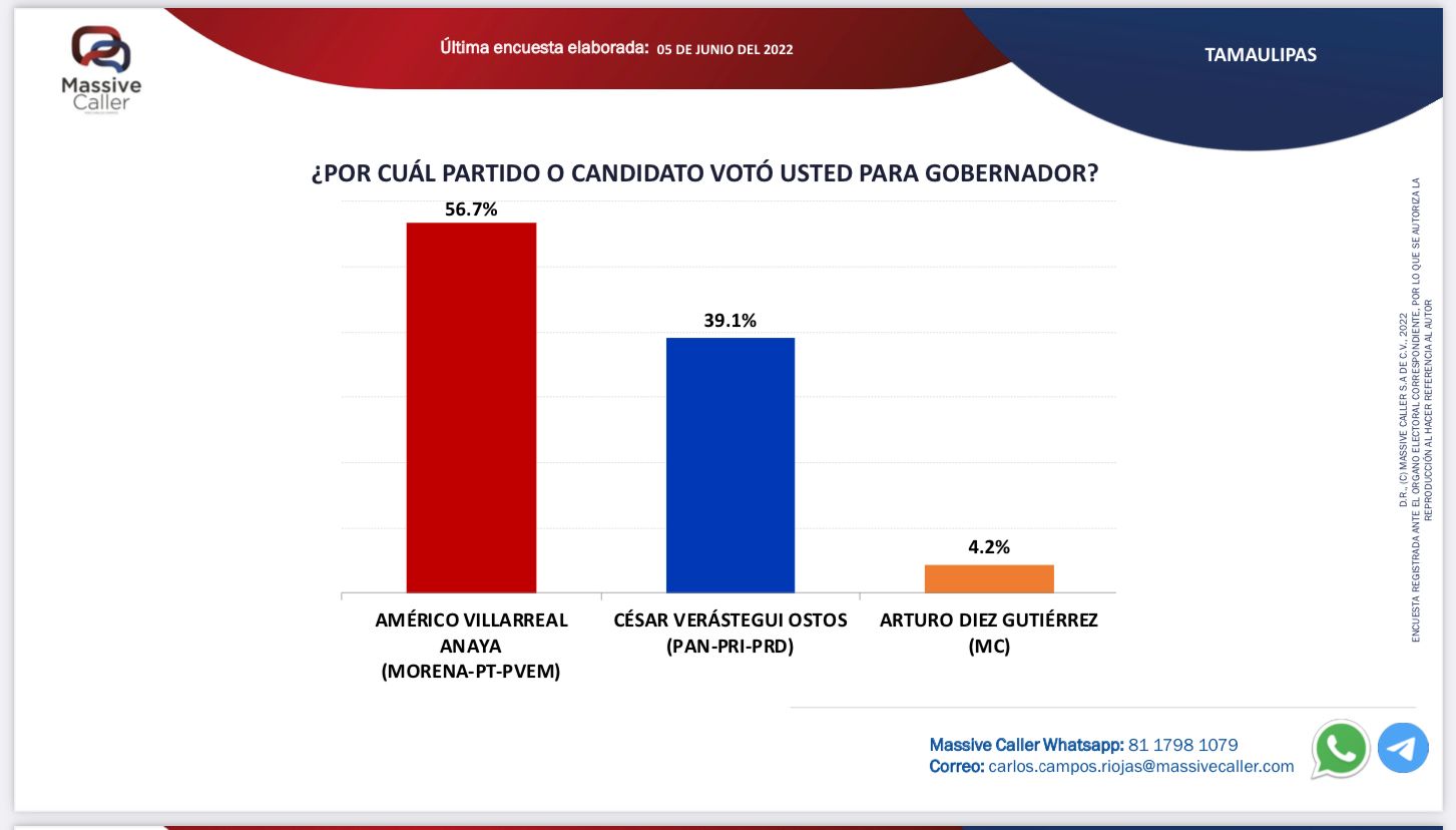 MORENA también ganaría en Tamaulipas, de acuerdo a Massive Caller, con el 56.7% de preferencias contra el 39.1% que obtendría César Verástegui de PAN-PRI-PRD. (EL HERALDO)
