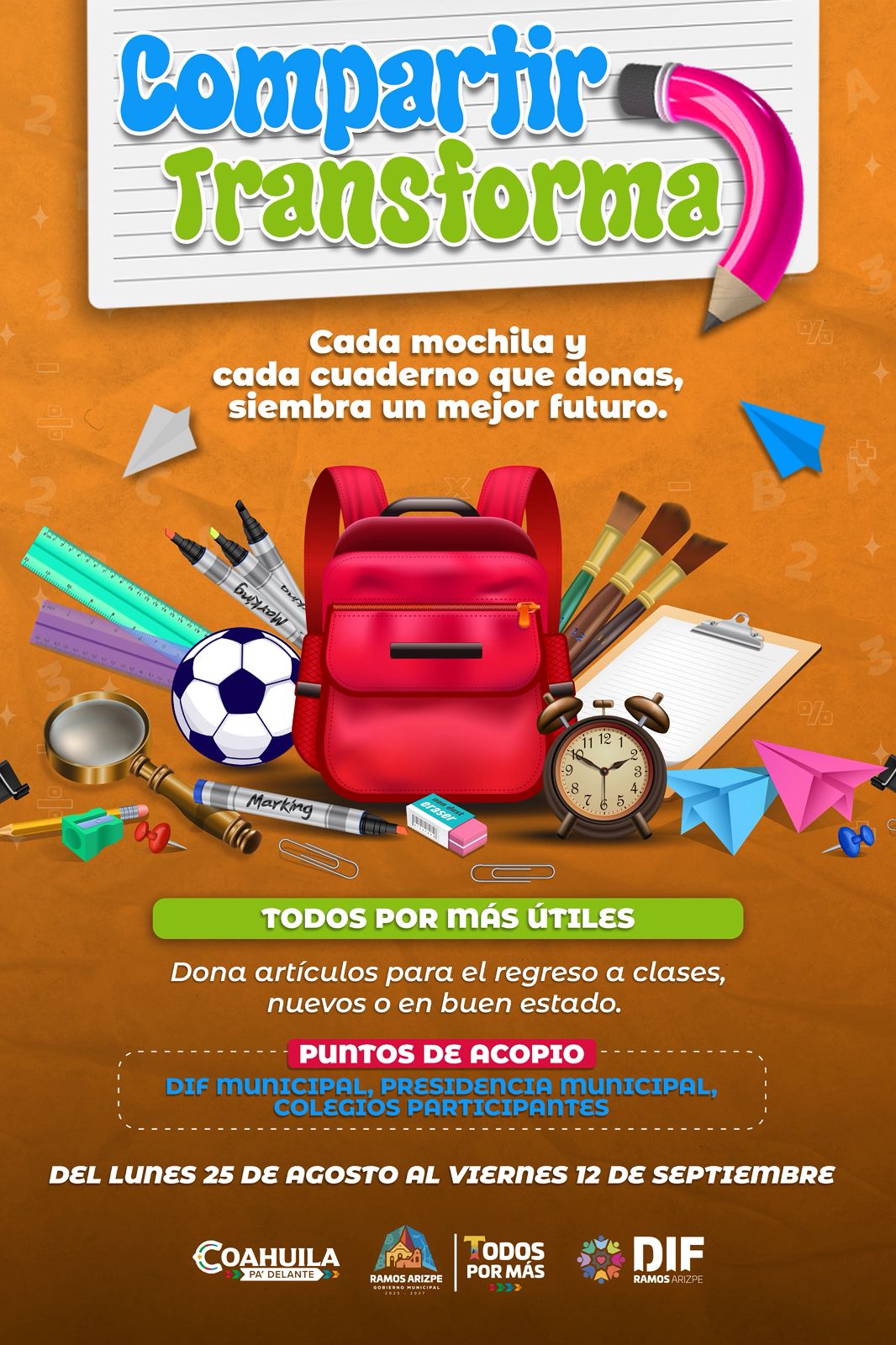 El Gobierno Municipal de Ramos Arizpe, por medio del DIF Municipal y con el respaldo de instituciones educativas, pone en marcha la campaña “Compartir Transforma”, con el propósito de recolectar mochilas, cuadernos y artículos escolares que serán destinados a estudiantes de escasos recursos en el inicio del ciclo escolar.