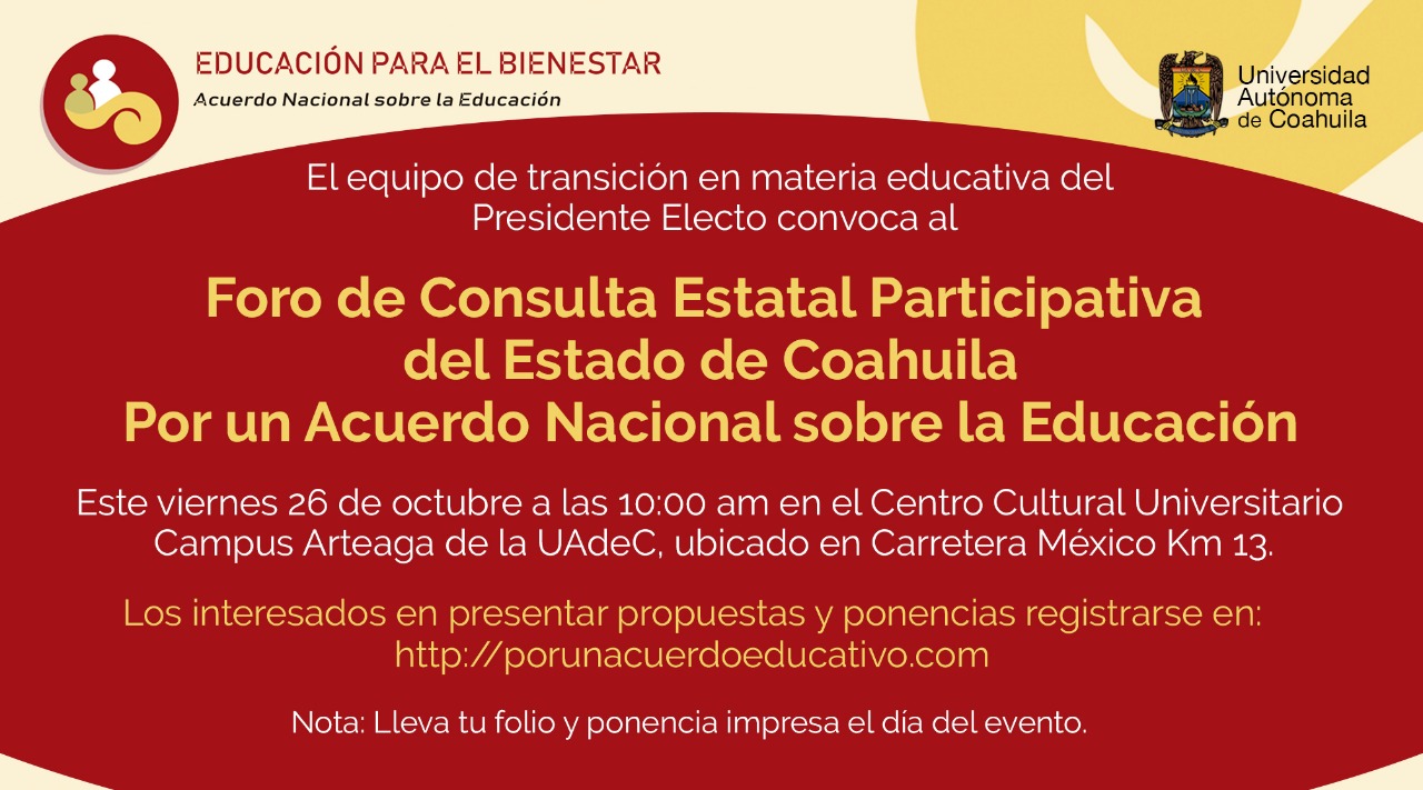 Ya se tienen registradas mil 238 ponencias para el foro de consulta «Por un Acuerdo Nacional por la Educación» que tendrá lugar en Saltillo este viernes, bajo la coordinación de la Universidad Autónoma de Coahuila y en el que se espera la asistencia de al menos mil 500 ciudadanos.