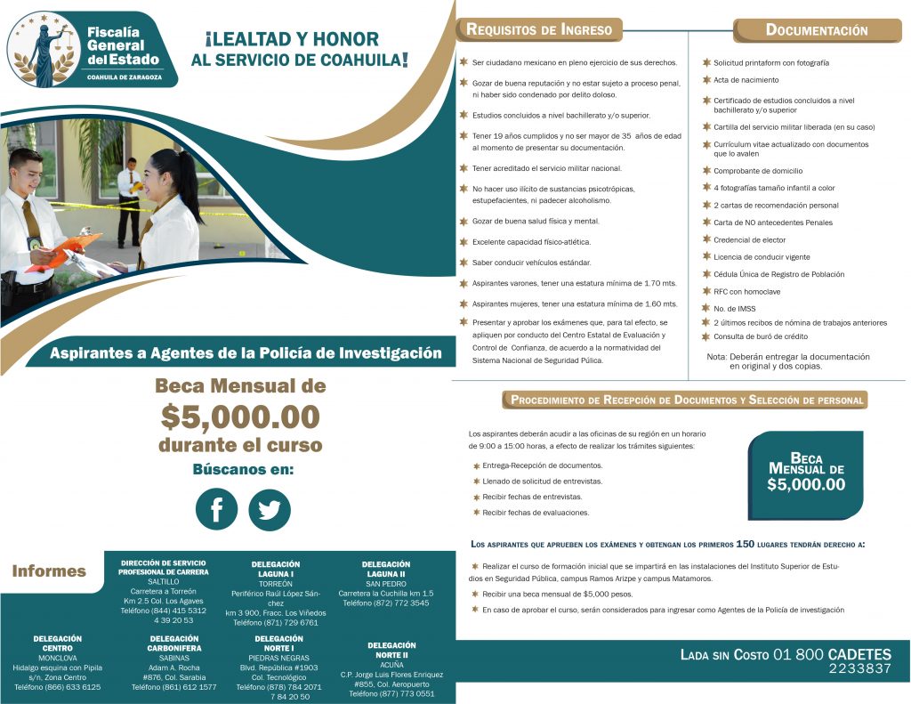 La Fiscalía General del Estado de Coahuila, convoca a hombres y mujeres de entre 19 y 35 años de edad, interesados en integrarse a la Policía de Investigación de la Agencia de Investigación Criminal; la FGE ofrece una beca mensual de 5 mil pesos.