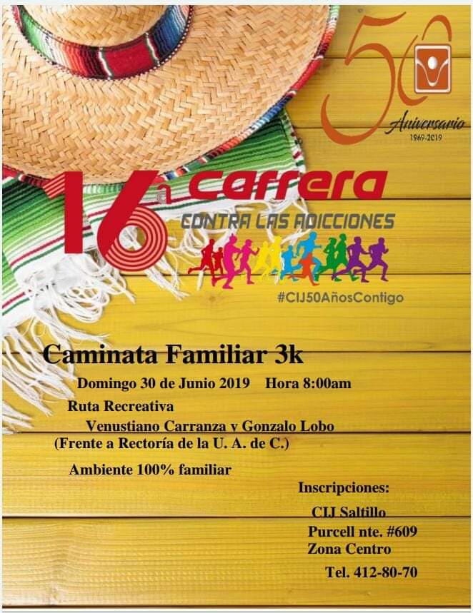Esta carrera se realizará este próximo domingo 30 de junio, el circuito será de 3 kilómetros y la salida será en el bulevar Venustiano Carranza de la ciudad de Saltillo justo enfrente de la rectoría de la UA de C. La inscripción es gratuita y se puede registrar en el Centro de Integración Juvenil ubicada en la colonia Analco en la Plaza Tula de Ramos Arizpe. (GABRIEL MARTINEZ)