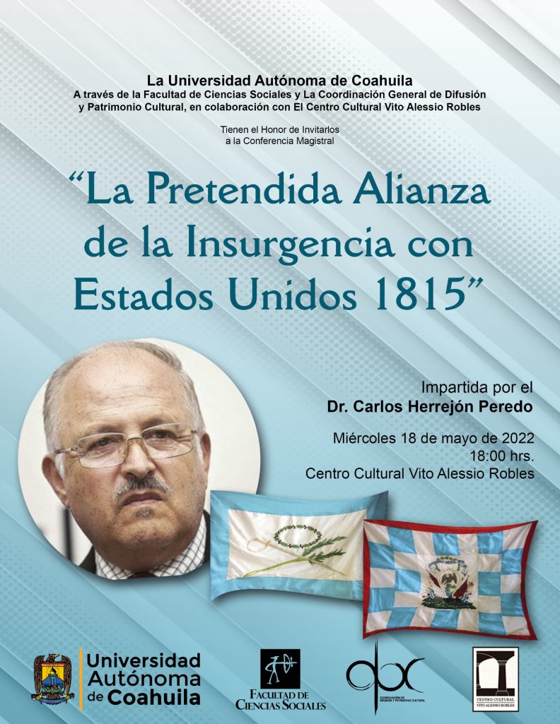 El próximo 18 de mayo de 2022, la Universidad Autónoma de Coahuila, a través de la Facultad de Ciencias Sociales y la Coordinación General de Difusión y Patrimonio Cultural invitan a la conferencia magistral “La Pretendida Alianza de la Insurgencia con Estados Unidos 1815” a cargo del Dr. Carlos Herrejón Peredo.