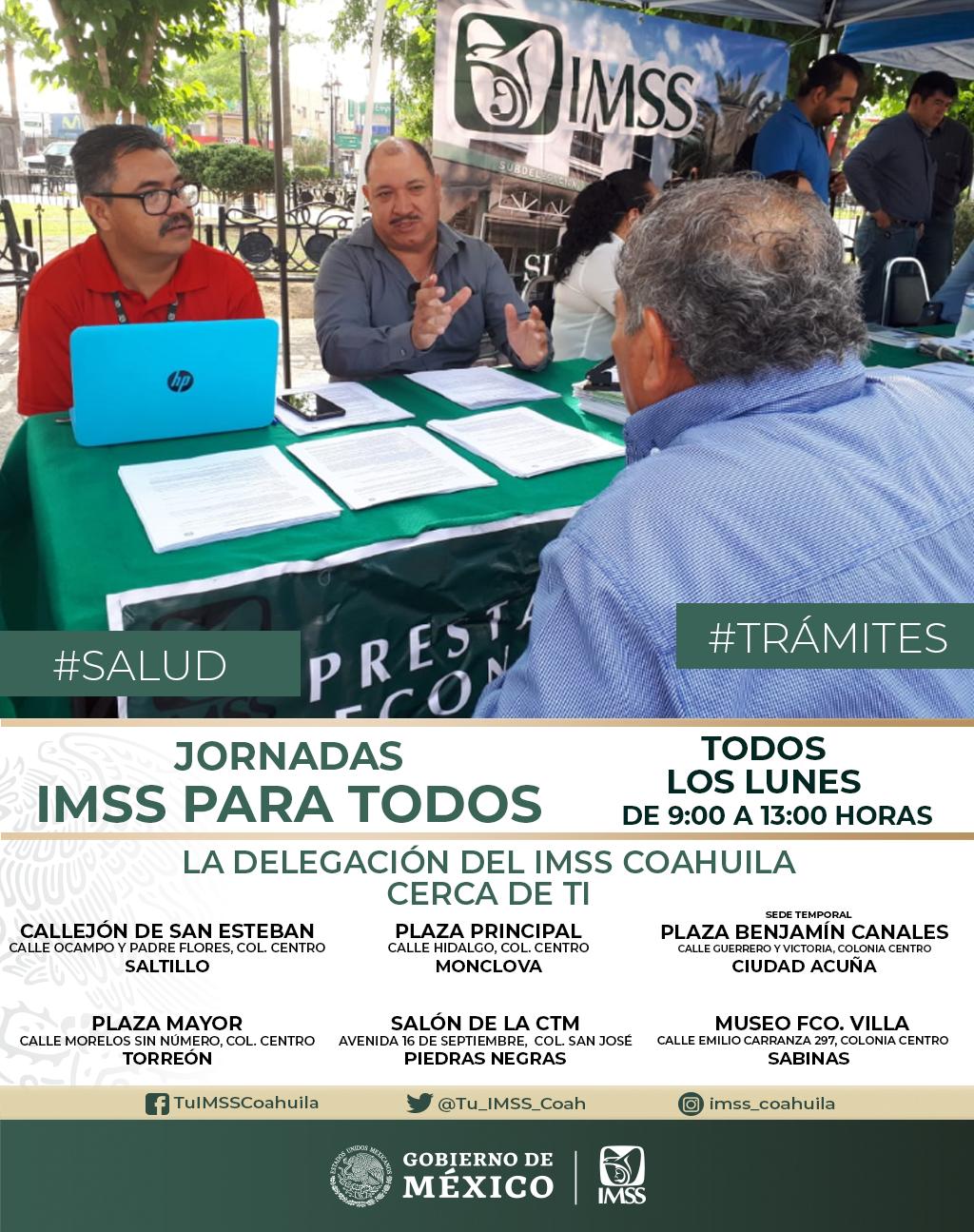 El próximo lunes 12 de agosto, la delegación Coahuila, del Instituto Mexicano del Seguro Social (IMSS), continuará con las jornadas IMSS Para Todos, en las subdelegaciones de Monclova, Torreón, Piedras Negras, Ciudad Acuña, Sabinas y Saltillo, de 09:00 a 13:00 horas.